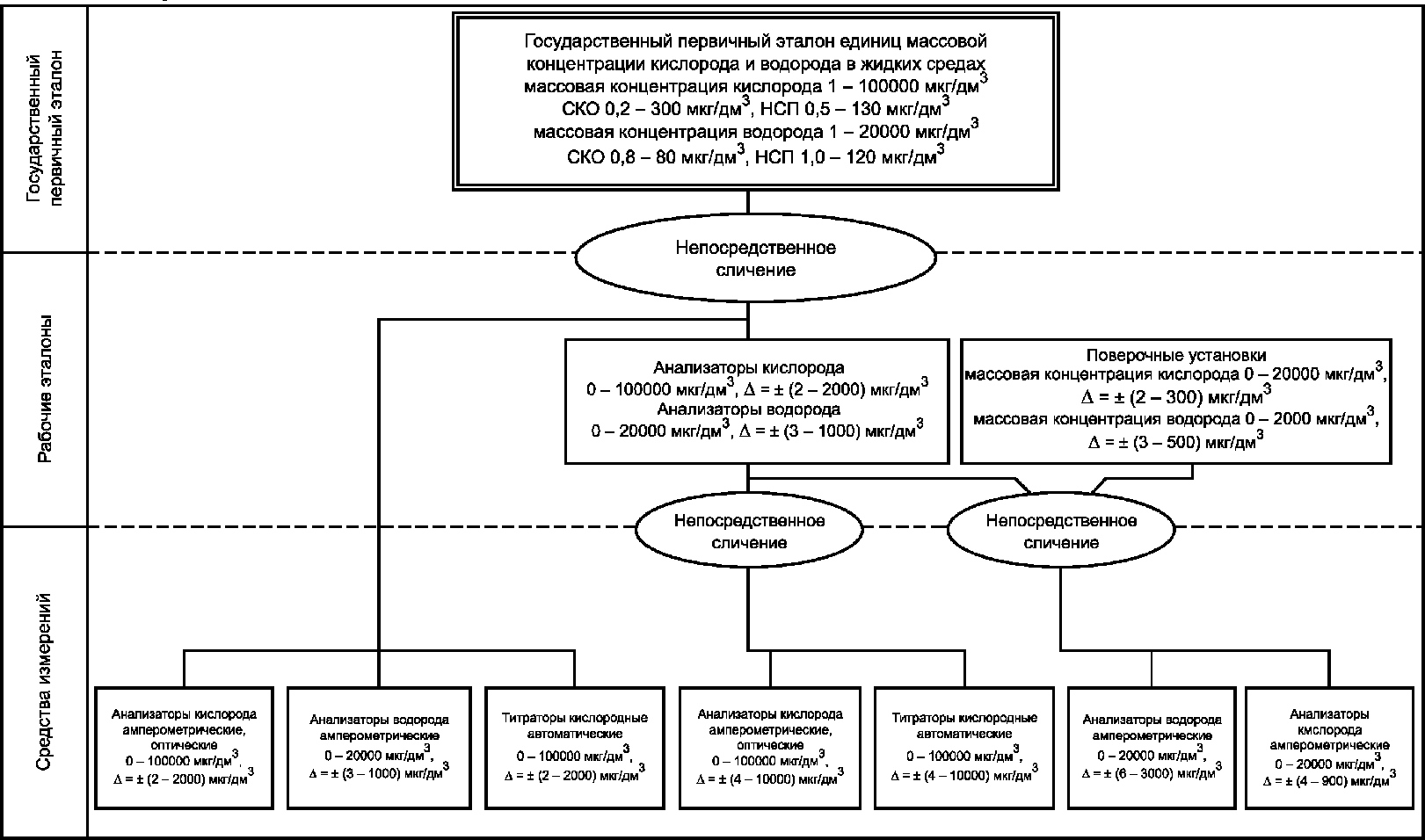 рисунок А.1 приложения А) для средств измерений массовой концентрации растворенных в воде кислорода и водорода и устанавливает порядок передачи единиц массовой концентрации растворенного в воде кислорода в диапазоне от 1 до 100000 мкг/дм