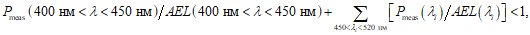 Из этого уравнения находим H1 = 42,44 мДж/см2 и H2 = 56,6 мДж/см2. Можно найти, что MPE1 = 1,3·10-6 Дж/см2, а MPE2 = 1,3·10-7 Дж/см2. В результате H1/MPE1 + H2/MPE2 намного больше 1, следовательно, предел безопасного облучения превышен.