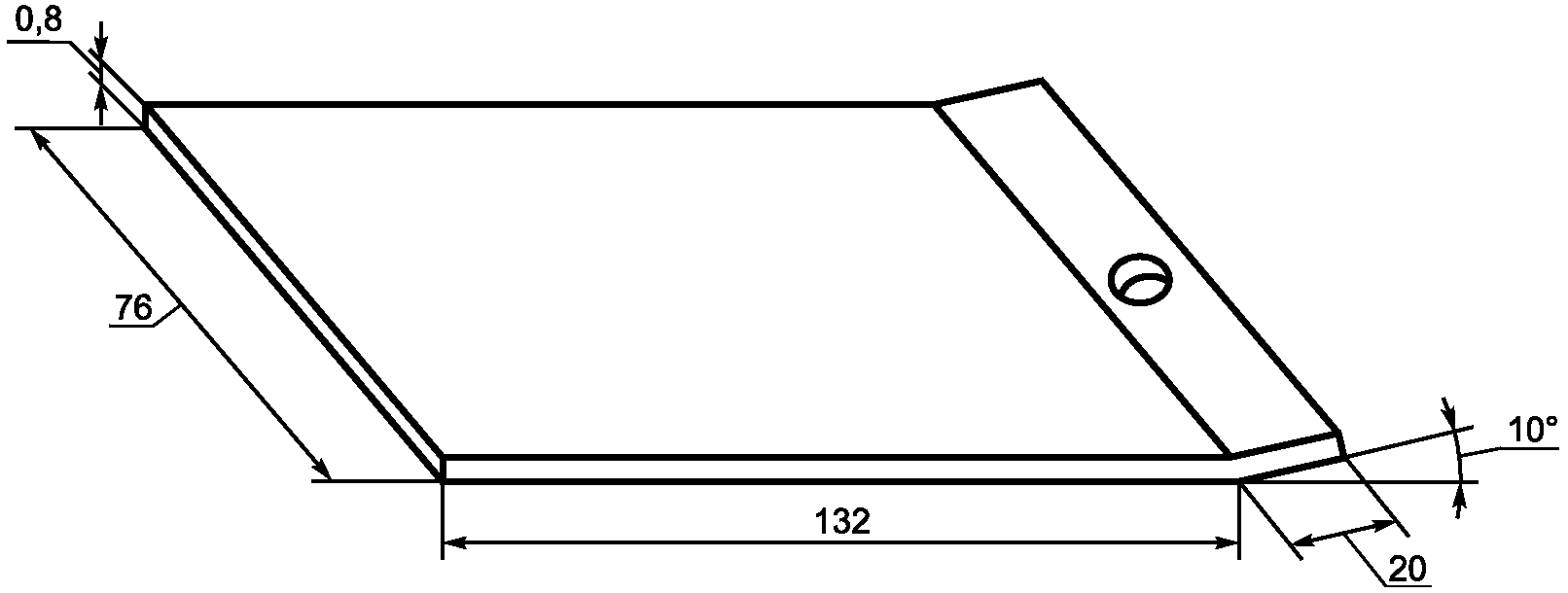5.2 Испытательная металлическая пластина (см. рисунок 2) толщиной 0,8 мм, шириной (76,0 +/- 0,5) мм, длиной 132 мм и испытуемой областью (76,0 +/- 0,5) x (131,5 +/- 0,5) мм = (100 +/- 1) см