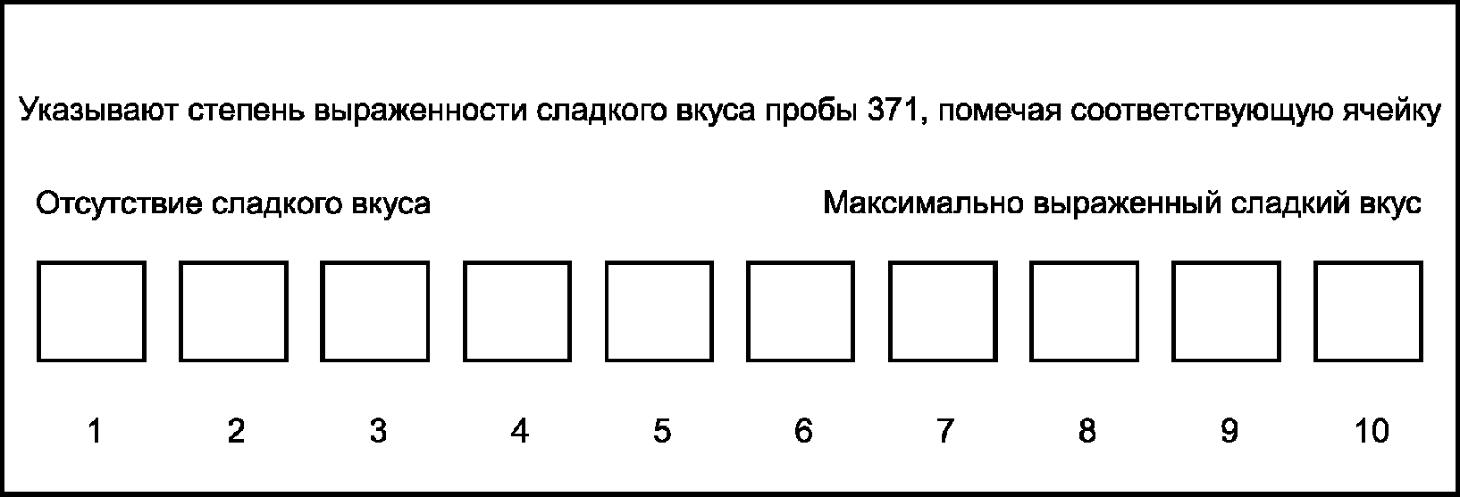 Каждый испытатель выдает результат, выбирая подходящий его вариант в вопроснике (например, обводя его кружком или помечая соответствующий прямоугольник на схеме), либо записывает численное значение, которое, по его мнению, соответствует воспринятому уровню интенсивности ощущений органолептического свойства, либо отмечает на шкале конкретную подходящую точку.