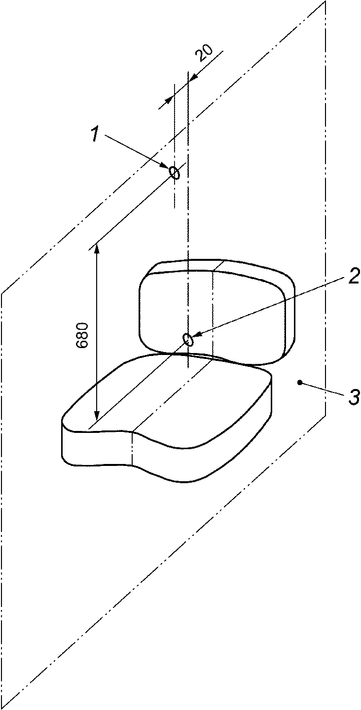 рисунку 2. На горизонтальной подставке, установленной на уровне точки расположения глаз оператора, располагают два точечных источника света, например по 150 Вт 12 В, установленных симметрично по отношению к базовой точке на расстоянии 65 мм друг от друга. Необходимо, чтобы подставка могла поворачиваться вокруг вертикальной оси, проходящей через базовую точку. При измерении зон затенения подставку необходимо повернуть таким образом, чтобы линия, соединяющая точечные источники света, была перпендикулярна линии, соединяющей элемент, препятствующий обзору, и точку расположения глаз оператора.