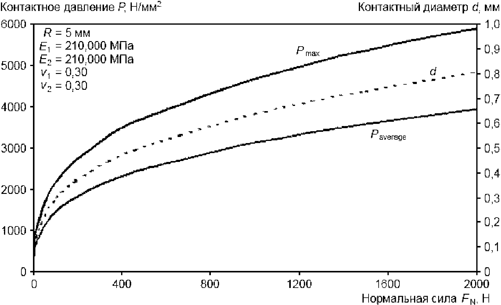 3.1.7 контактное давление Герца (Hertzian contact pressure): Значение давления в любом месте в зоне контакта Герца, вычисленная по уравнению упругой деформации Герца. Контактное давление Герца также можно вычислить и записать как максимальное значение в центре контакта Pmax или как среднеарифметическое значение давления по всей зоне контакта Paverage (см. ASTM D 7421).