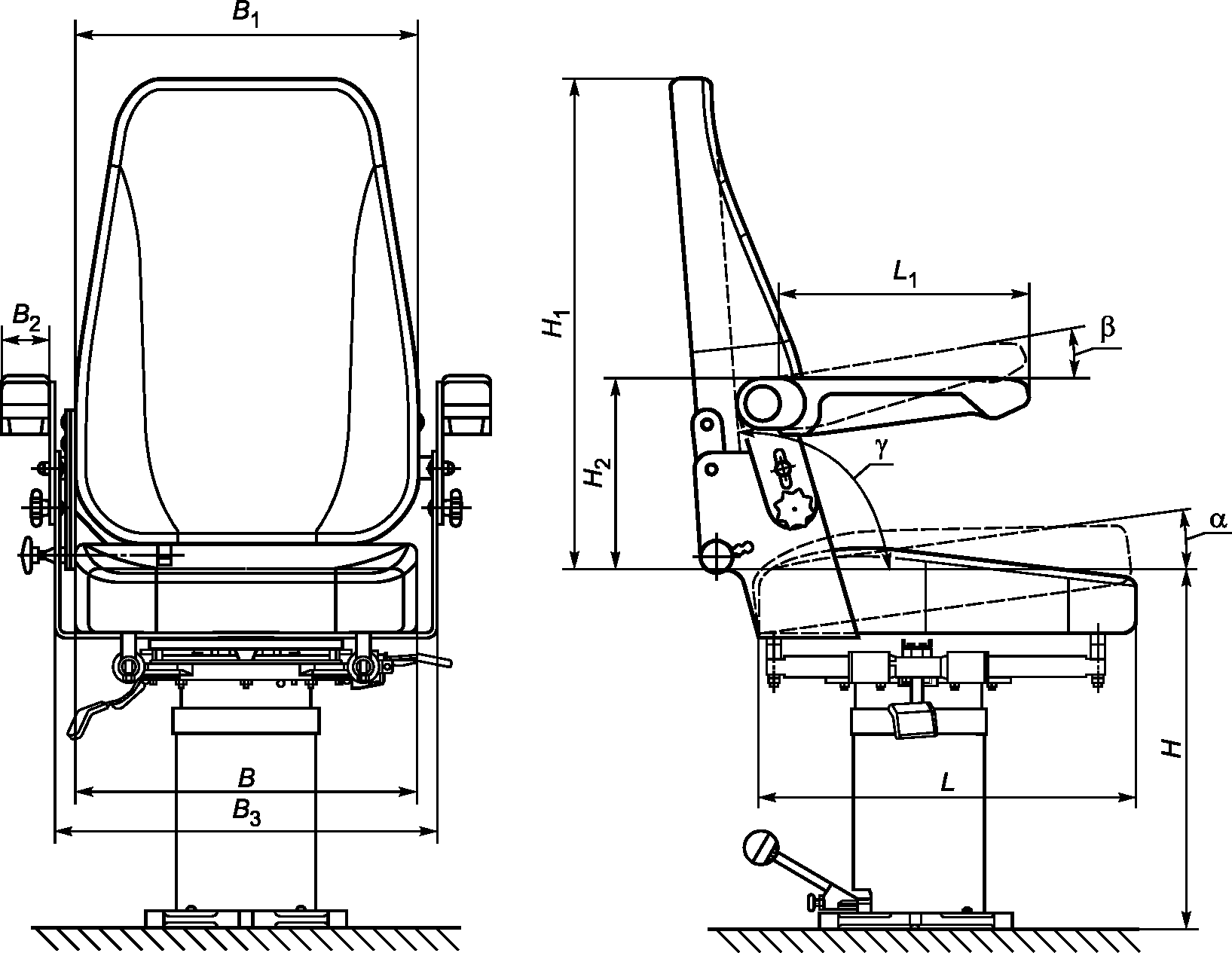 Высота поверхности сиденья H | По перпендикуляру от середины верхнего переднего края сиденья кресла в крайнем нижнем положении до опорной поверхности для стоп ног. Определяют с учетом просадки элементов кресла под статической нагрузкой от массы тела человека 75 кг |