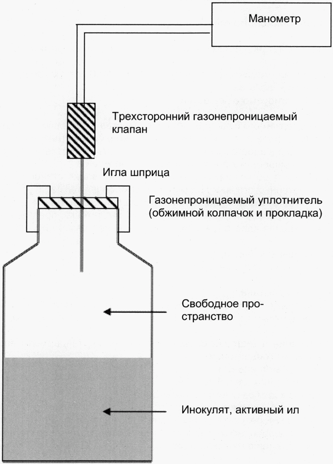 Примечание - Для сосудов рекомендуется использовать газонепроницаемые силиконовые крышки. Газонепроницаемость крышек, особенно изготовленных из бутилкаучука, рекомендуется проверять, поскольку некоторые промышленно доступные крышки не являются газонепроницаемыми для метана и не остаются плотными после их прокалывания иглой в условиях испытания. Для летучих веществ рекомендуется использовать газонепроницаемые крышки с покрытием (некоторые промышленно доступные крышки являются относительно тонкими менее чем 0,5 см и не остаются газонепроницаемыми при прокалывании иглой шприца). Если тестируемые вещества не являются летучими, то рекомендуется использовать бутилкаучуковые крышки (толщиной примерно 1 см). Такие крышки обычно сохраняют газонепроницаемость после прокалывания иглой. Перед испытанием следует тщательно исследовать крышку на способность сохранять газонепроницаемость после прокалывания иглой;