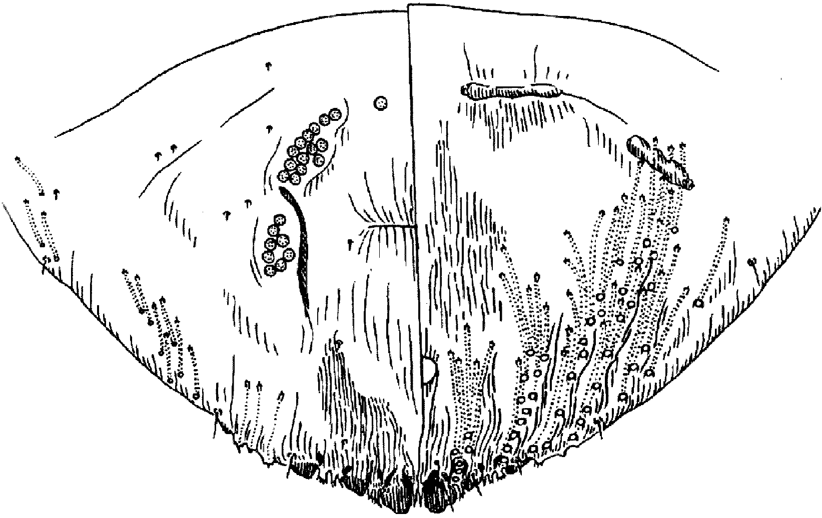 85 (86) Дорсальные железы на пигидии расположены беспорядочно. Щиток