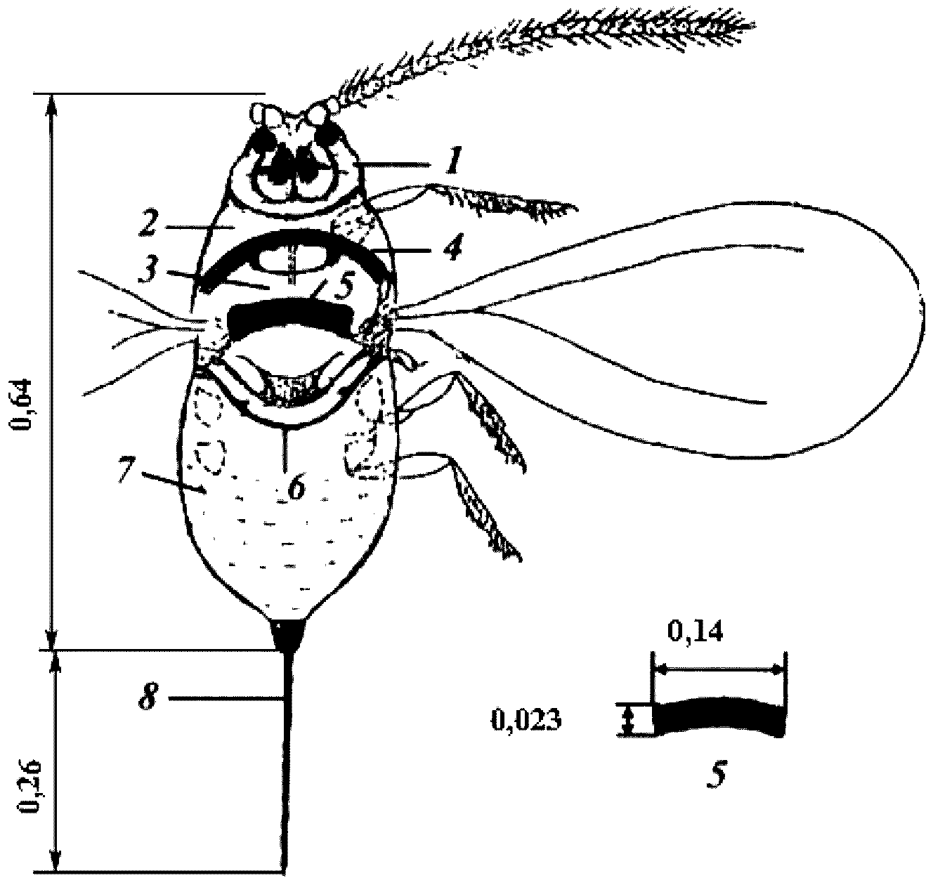 Пигидий самки | Имеет три пары долек: дольки первой пары L1 несколько длиннее своей ширины, почти симметричные, с закругленной вершиной, выемка по наружному краю имеется или отсутствует. Дольки второй пары L2 широкие, асимметричные, с закругленной, реже заостренной вершиной. Дольки третьей пары L3 в виде небольшого зубчика. Первая вырезка пигидия с двумя щетинковидными гребешками короче L1. Вторая вырезка - с одним или двумя узкими, часто зазубренными по краю гребешками, третья вырезка с двумя или тремя более широкими, неправильной формы гребешками, часть из них сильно зазубрена; величина гребешков варьирует. Дорсальные железы короткие, на пигидии они образуют группу из трех-пяти желез и второго ряда по четыре-восемь и 10 - 15 желез. Четвертый сегмент брюшка с группой из трех-семи желез и третий сегмент с тремя-четырьмя, второй с одной железой. Вентральные железы тонкие и маленькие, расположены группами вдоль края пигидия. Циркумгенитальных желез пять групп, реже четыре, их формула 0 - 8 (5 - 14) 5 - 17 | Широко закруглен, с тремя парами долек. Дольки первой пары L1 широкие, симметричные, с выемкой с обеих сторон или только с наружной стороны. Дольки второй пары L2 короче L1, асимметричные. Дольки третьей пары L3 подобны L2 или сильно редуцированы. Первая вырезка пигидия с двумя разветвленными на вершине гребешками, такой же длины, как L1, вторая - с двумя, третья - с тремя длинными гребешками, почти все они зазубрены по краю. Спереди от L3 край пигидия с двумя-тремя короткими крыловидными гребешками. Дорсальные железы длинные, на пигидии многочисленны, на четвертом сегменте брюшка железы обычно имеются, на препигидиальных сегментах желез нет. Циркумгенитальных желез от четырех до пяти групп, их формула 0 - 8 (8 - 14) 7 - 11 | Гребешки в первой вырезке пигидия самки европейской грушевой щитовки короче долек и не разветвлены на вершине. Дорсальные железы не столь многочисленны и обычно отсутствуют на четвертом сегменте брюшка | Закругленный (см. рисунок Б.24, приложение Б). Дольки первой пары L 1 короткие, расположены близко друг к другу, без гребешков между ними. Дольки второй пары L 2 хорошо развиты и склеротизированы. Третья пара долек слабо развита и плохо выражена. Гребешки простые, небольшие по размерам и расположены во второй и третьей вырезках пигидия, иногда отсутствуют. Циркумгенитальные железы имеются, представлены четырьмя группами, количество желез небольшое. Дорсальные железы ограничены пигидием, маленькие и тонкие, расположены неровными рядами в небольшом количестве. Анальное отверстие достаточно маленькое, его диаметр меньше диаметра долек первой пары в три раза |