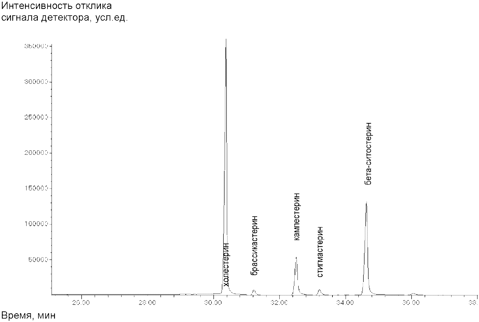 После проведения анализа с помощью системы обработки данных фиксируют на масс-хроматограммах пики в области времен удерживания, соответствующих выходу холестерина и фитостеринов.