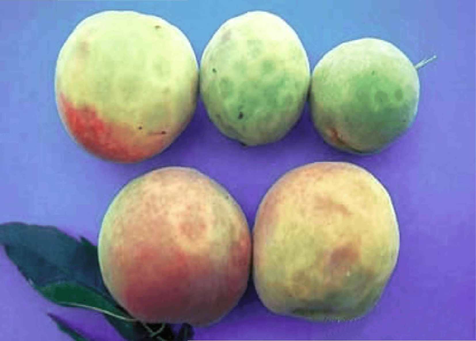 Б.4 Развитие симптомов на растениях персика (Prunus persica) зависит от штамма потивируса шарки слив. Большинство сортов персика при заражении штаммом PPV-D не образуют симптомов на листьях, но на их плодах могут развиваться хлоротические пятна, желтые кольца или линейный рисунок. Плоды деформируются, изменяют форму и имеют небольшие коричневые или некротические участки на кожице. Мякоть плодов буреет, их вкусовые качества снижаются, пораженные плоды могут преждевременно опадать.