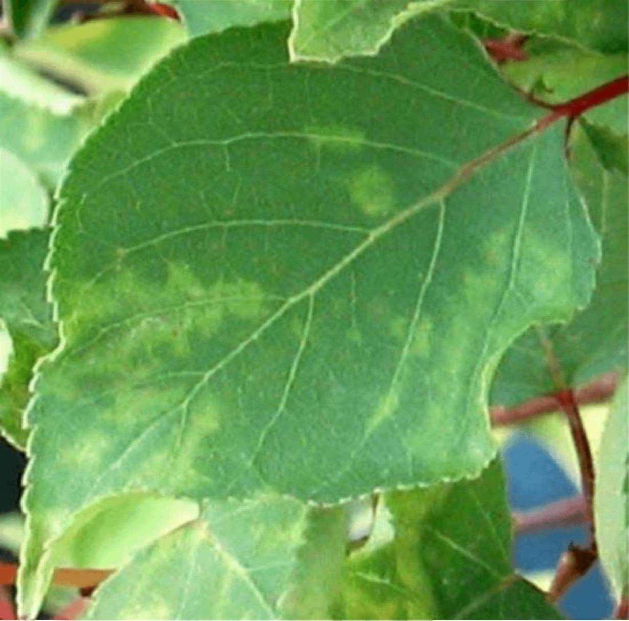 Б.3 Симптомы шарки слив на листьях абрикоса (Prunus armeniaca) напоминают симптомы у сливы, но у большинства сортов обычно встречаются лишь на отдельных листьях. Вскоре после распускания на листьях появляются светло-зеленые пятна и кольца, которые лучше различимы в проходящем свете. Вдоль главных жилок часто развивается светло-зеленое окаймление шириной 1 - 2 мм. На последующих листьях симптомы отсутствуют, поэтому зараженные листья необходимо выявлять у основания побегов. С наступлением жаркой погоды симптомы могут полностью маскироваться.