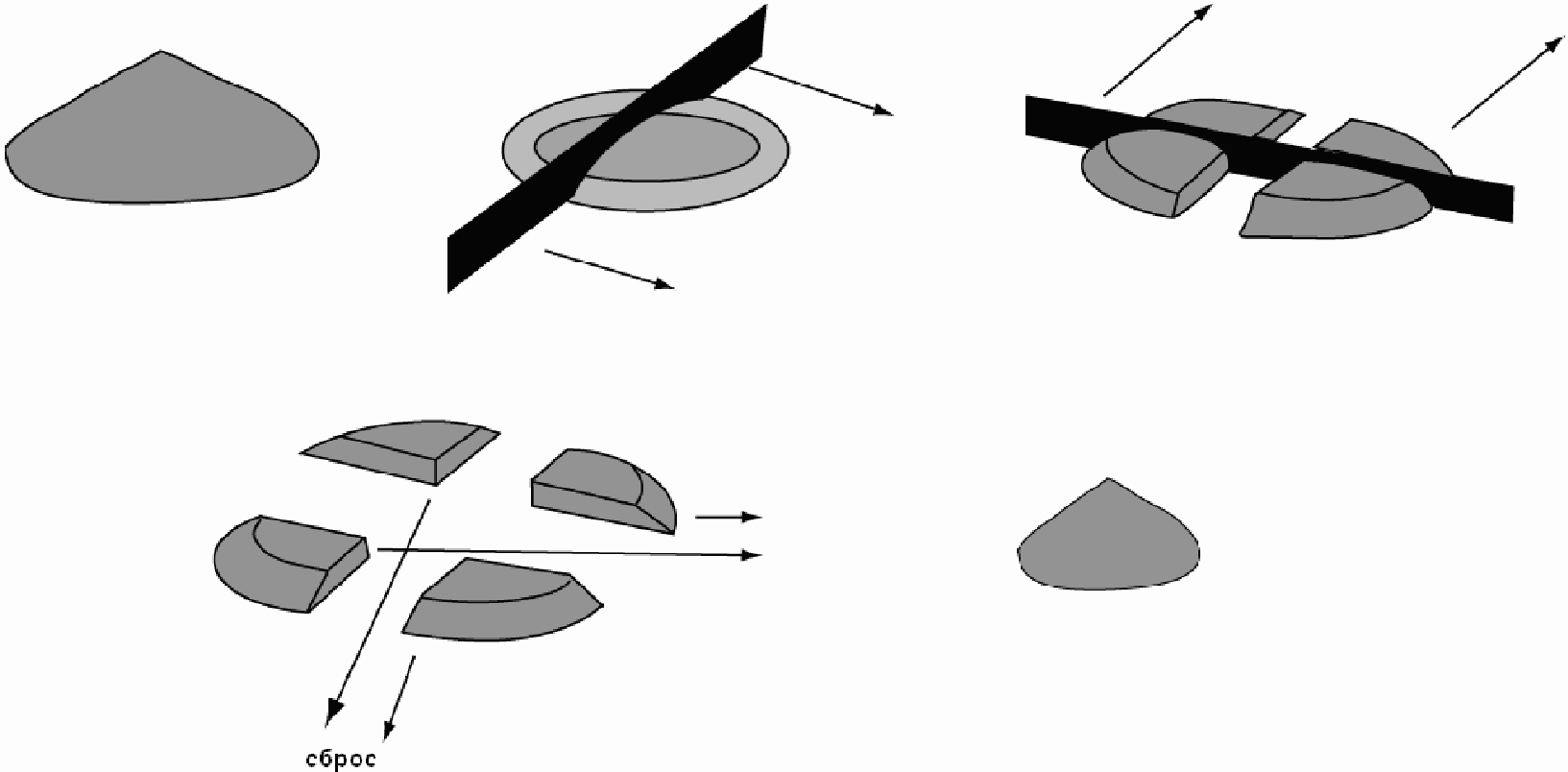 3 | Сокращение и/или расщепление пробы с целью последующего измельчения и/или с целью сделать возможным разделение | Сокращение массы | - | - | - | - | - | - | - | - | Часть пробы для определения гранулометрического состава, устойчивости к истиранию, содержания влаги и т.д. |