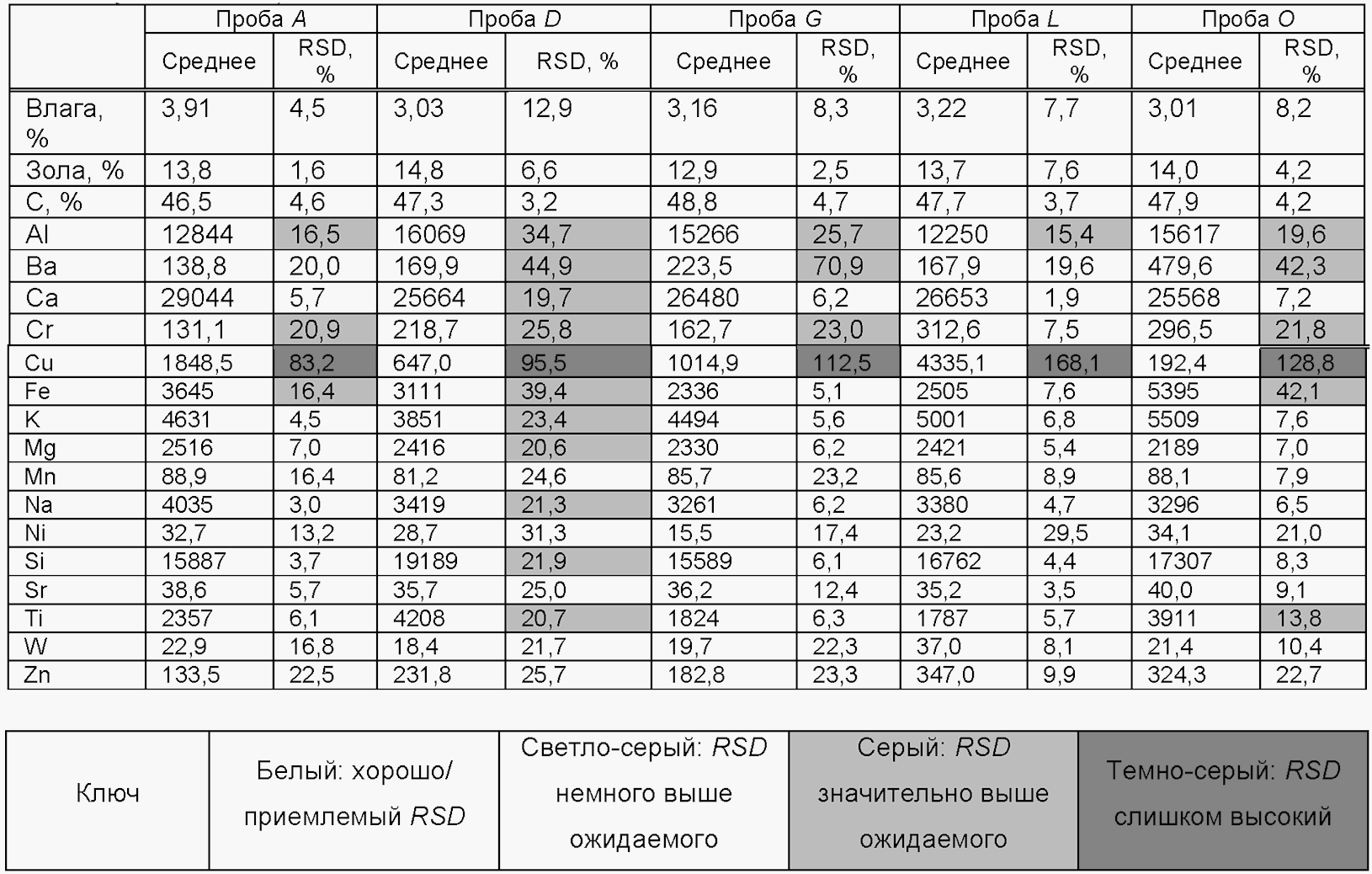 Для оценки вариативности следует помнить, что она включает в себя неопределенности, связанные с отбором проб, пробоподготовкой и испытаниями. Определение содержания влаги, зольности и элементов проводили с использованием всего объема испытываемой пробы, поэтому ошибка пробоотбора в этом случае не существенна.