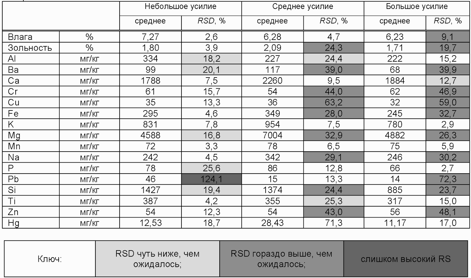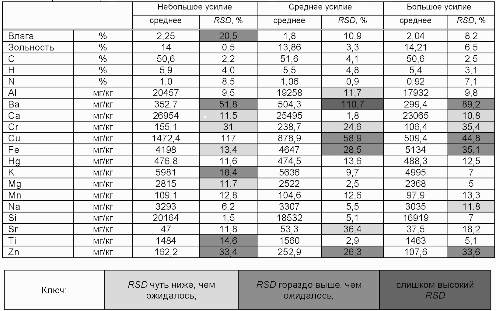 Процесс обработки существенно влияет на дисперсию для большинства параметров; для конечного значения макрооднородности, процедура низкой степени обработки показывает как правило дает меньшую дисперсию по сравнению с процедурами высокой и средней степени обработки. Исключением является Pb, дисперсия которого при низкой степени обработки очень высока; отдельные, не приведенные здесь, результаты показывают, что только в пробе для испытаний содержание Pb в 10 раз выше, чем во всех остальных; это можно объяснить возможным наличием одного "фрагмента" сильно загрязненной древесины, которая попала только в эту пробу для испытаний: полагают, что дисперсия Pb обусловлена не обработкой, а природой пробы.