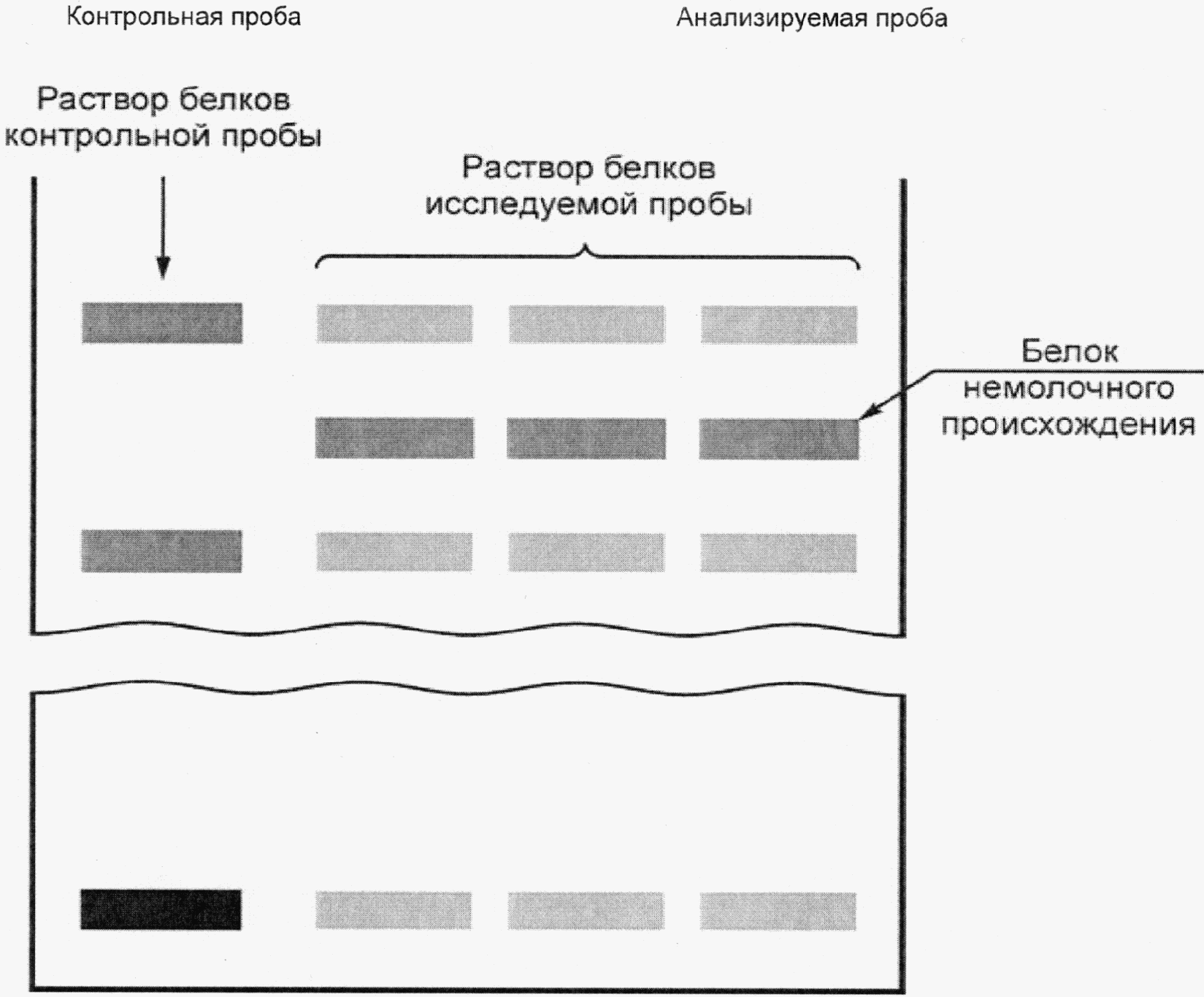 В случае возникновения разногласий о наличии в анализируемой пробе белков немолочного происхождения (слабое изображение отдельных фракций) анализ повторяют, увеличив концентрацию белков в растворе анализируемой пробы.