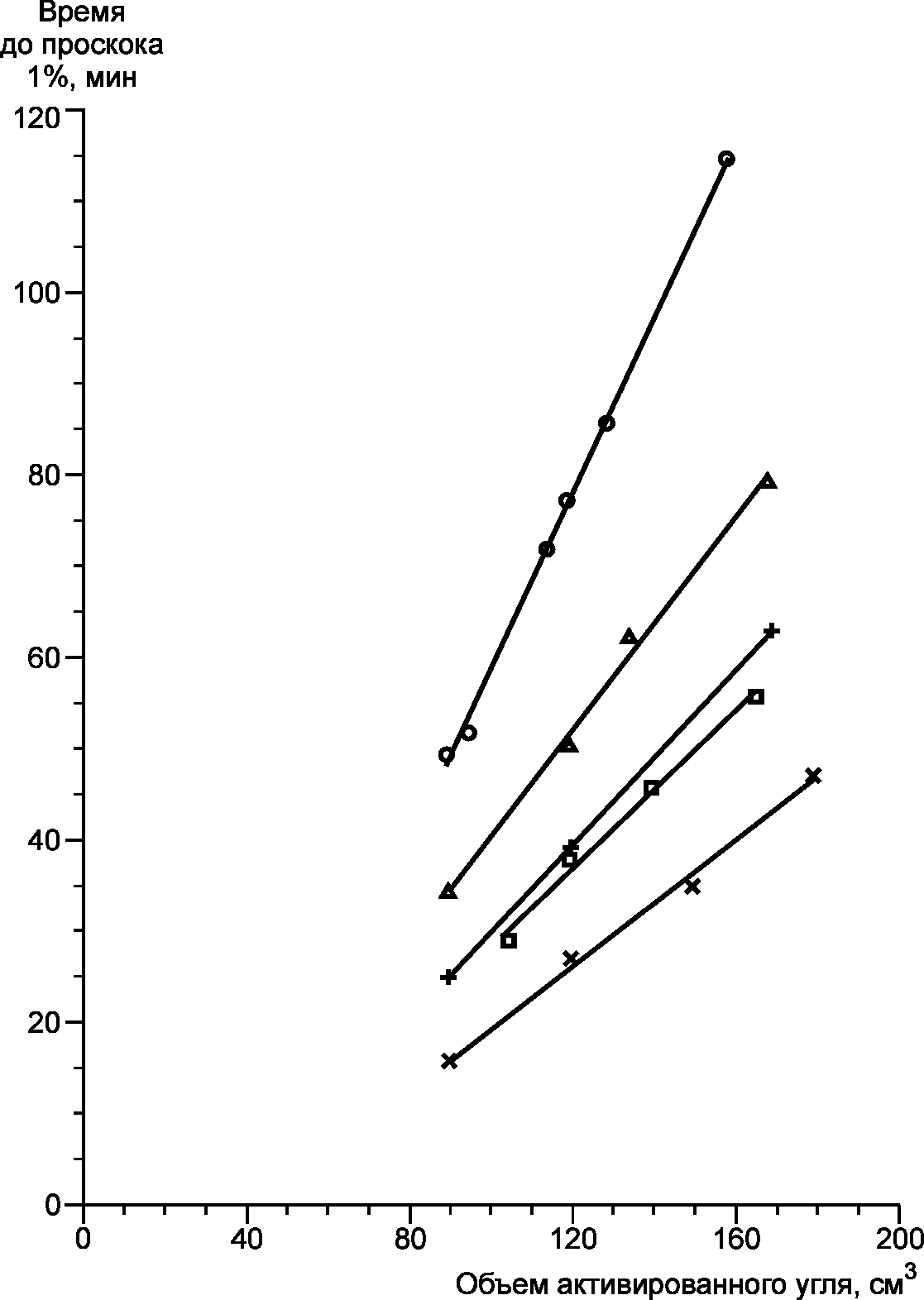 Практически линейный характер полученной зависимости означает, что в условиях проведенных испытаний динамическая активность активированного угля практически не зависит от скорости газового потока. В одном из исследований зафиксировано постоянство динамической активности при 30-кратном изменении скорости газового потока