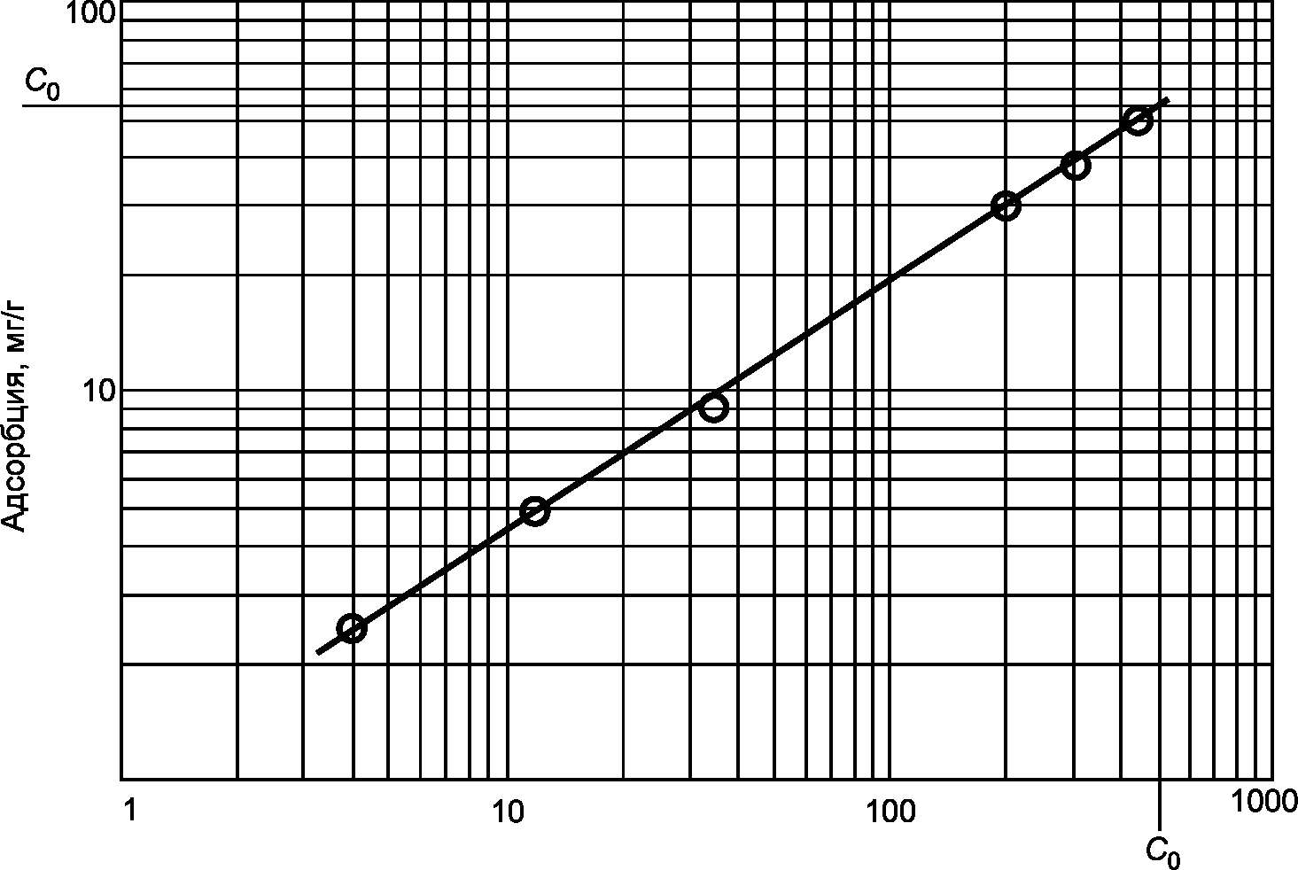 11.2.2 Если вертикальная линия, проведенная из точки по оси абсцисс, соответствующей начальной концентрации C0, и изотерма графика экстраполируется до пересечения с этой линией, то значение X/M в точке пересечения может быть считано по оси ординат. Это значение, называемое [X/M] C0, представляет собой количество адсорбируемых примесей, когда уголь находится в равновесии с исходной концентрацией. Это значение представляет собой адсорбционную способность угля.