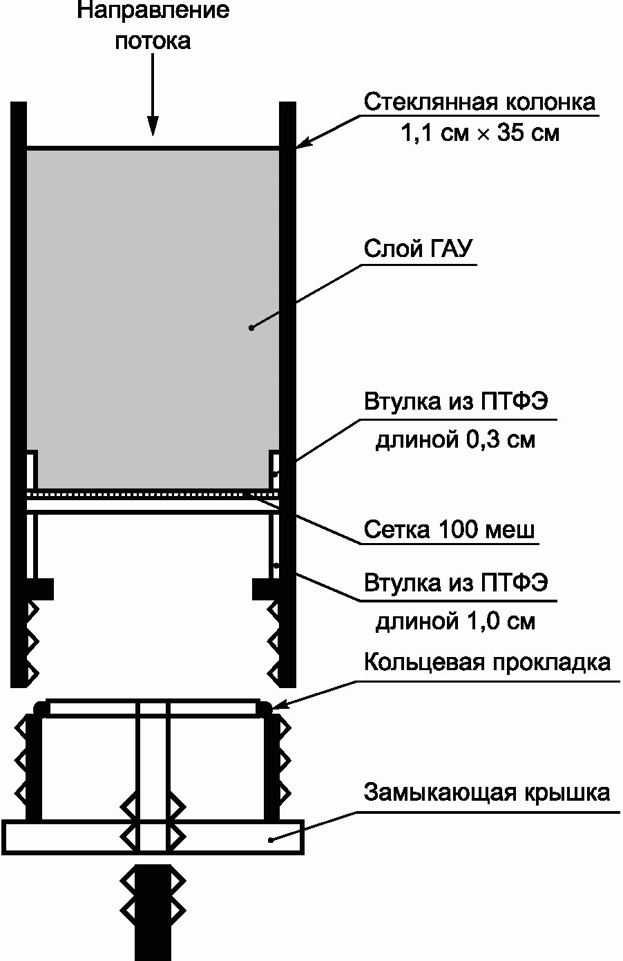 Подушка из тонковолокнистой стекловаты, образующая по всему диаметру колонки ровную горизонтальную поверхность, служащая опорой слою ГАУ. Альтернативно, слой гранулированного активированного угля может опираться на сетку из нержавеющей стали (100 меш), расположенную между двумя короткими втулками в виде трубок из PTFE с толщиной стенок 2 дюйма (рисунок 2). Диаметр втулок должен точно соответствовать внутреннему диаметру колонки, чтобы жидкость не просачивалась между втулкой и стенкой колонки.