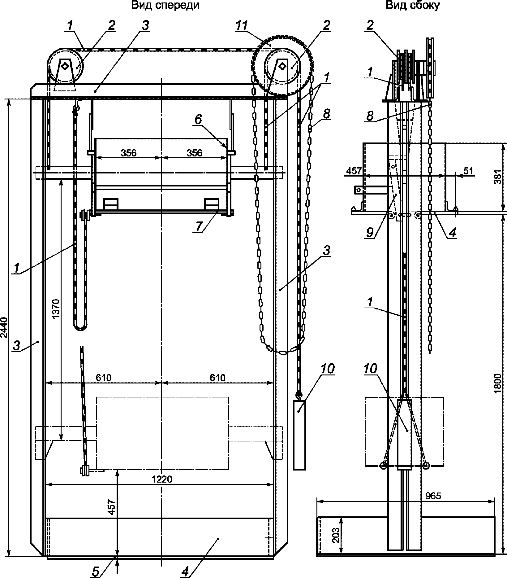 1 - проволочный трос, 3 мм; 2 - шкив, диаметр 152 мм;