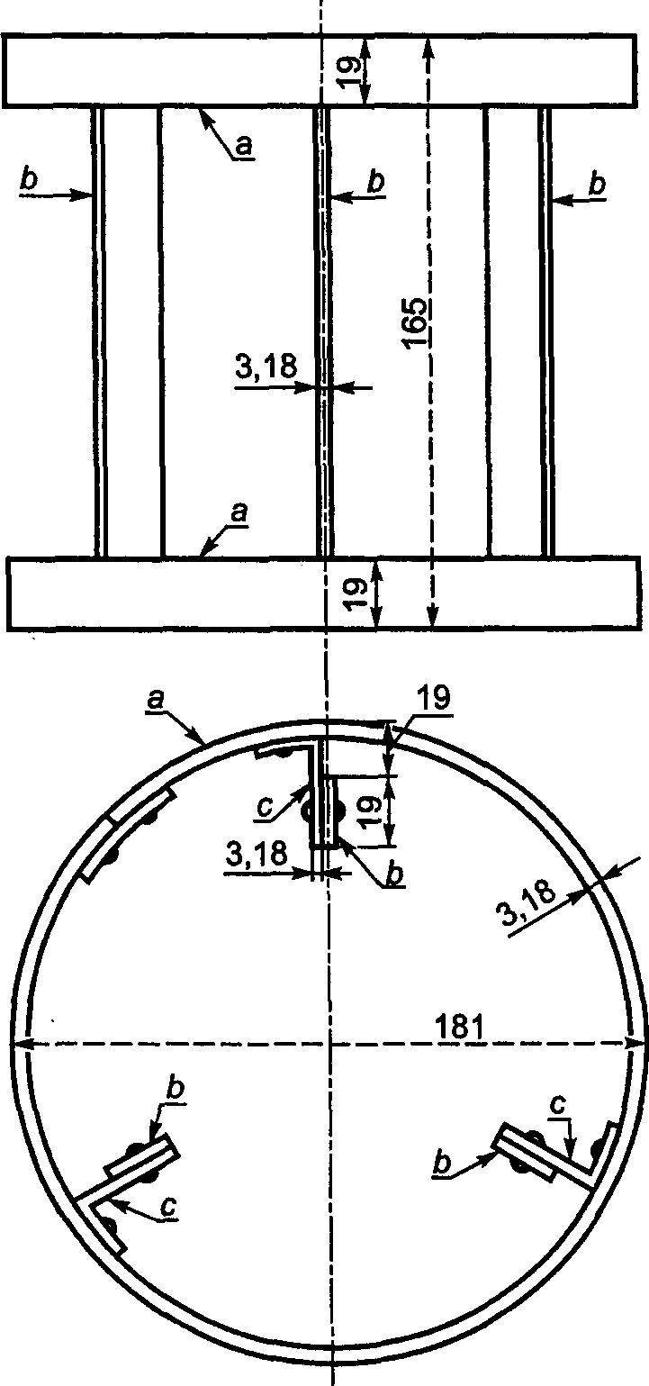 4.1. Толщина стенок должна составлять не менее 6,35 мм (1/4 in.), за исключением нижней и верхней частей. Рекомендуется, чтобы крышка, резиновая прокладка и металлические гибкие пластины, охватывающие цилиндр, были аналогичны описанным в
