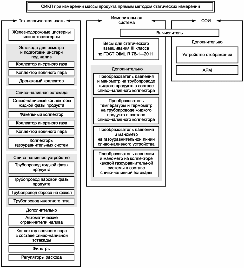 ГОСТ OILM R 76-1-2011 при выполнении измерений прямым методом статических измерений взвешиванием на весах расцепленных цистерн;