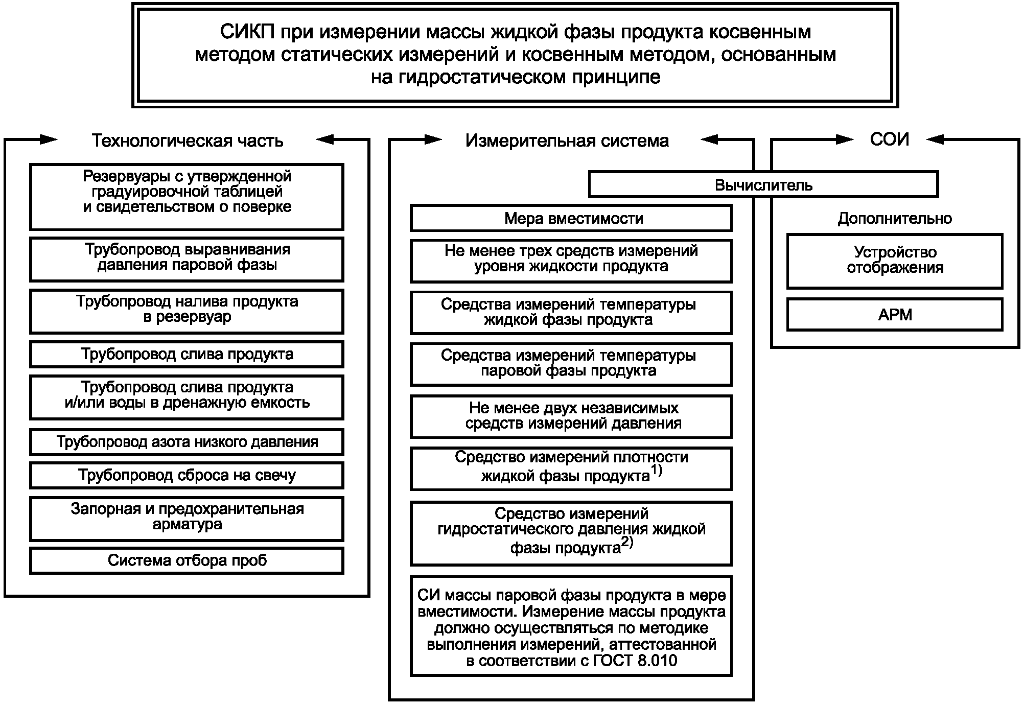 - не менее трех средств измерений уровня жидкой фазы продукта с пределами допускаемой абсолютной погрешности не более +/- 3 мм;