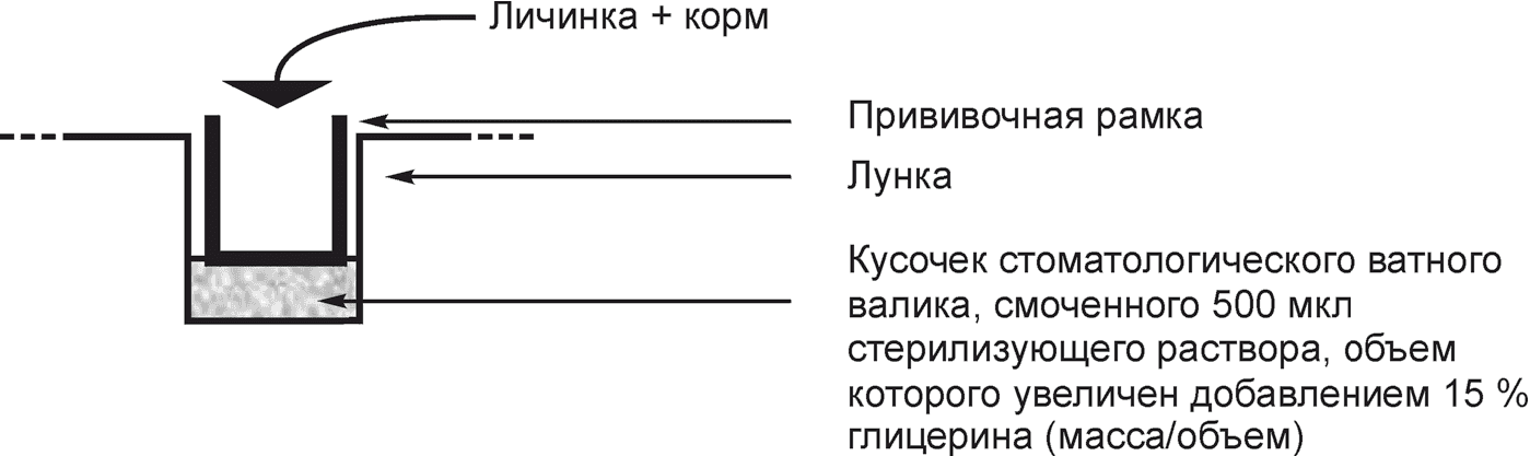6.1.1 Личинок разводят в прививочных рамках из кристаллического полистирола (например, ref CNE/3, NICOTPLAST Society), имеющих внутренний диаметр 9 мм и глубину 8 мм. Рамки сначала стерилизуют, например, погружением на 30 мин в этанол или другой стерилизующий раствор, а затем сушат в вытяжном шкафу с ламинарным потоком. Каждую рамку помещают в лунку 48-луночного планшета. Верхнюю часть прививочной рамки можно поддерживать на уровне планшета, например размещением на дне лунки кусочка стоматологического ватного валика, смоченного 500 мкл стерилизующего раствора, объем которого увеличен добавлением 15% глицерина (масса/объем)