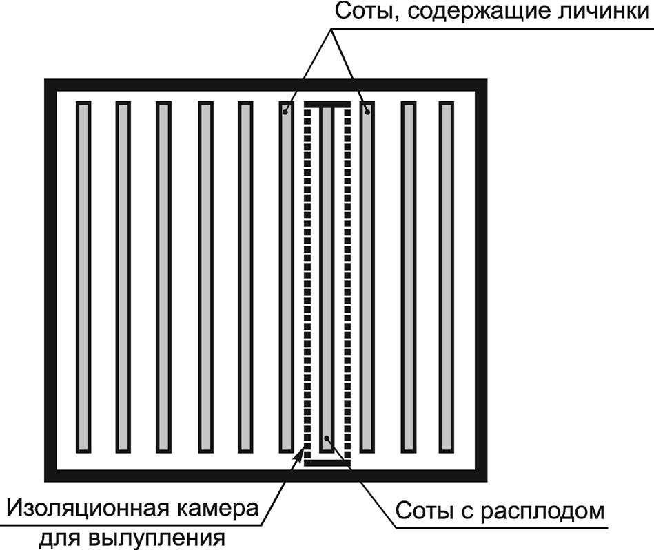 (рисунок 2). Изоляционную камеру для вылупления помещают рядом с сотами, содержащими расплод. На D2 максимум через 30 ч после выдерживания в камере королеву выпускают из камеры после проверки на наличие свежих отложенных яиц. В зависимости от фертильности королевы рекомендуется сократить время изоляции для минимизации вариабельности в размере и возрасте личинок. Соту, содержащую яйца, оставляют в камере рядом с расплодом на стадии инкубации и до вылупления (D1).
