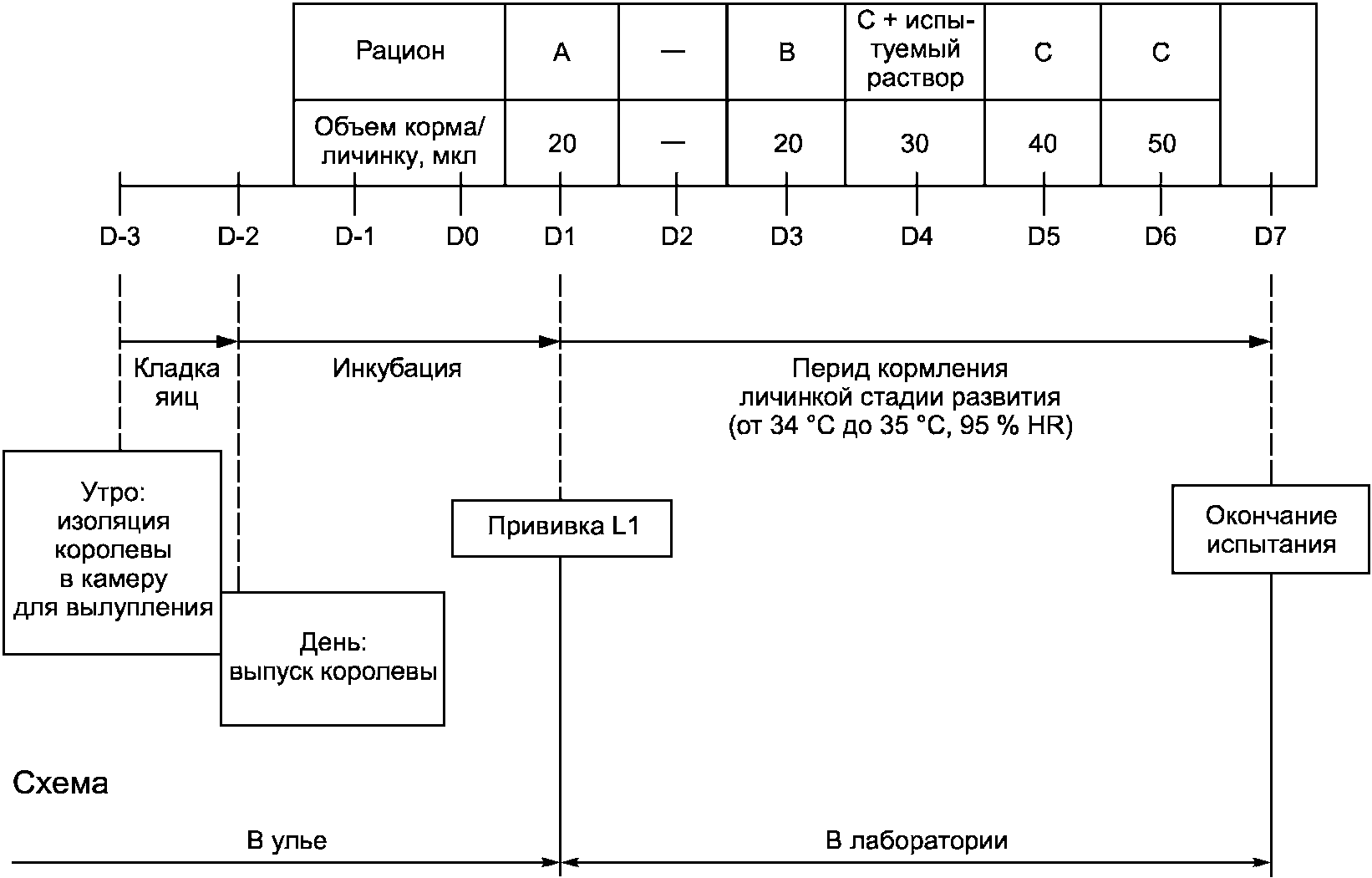 На первые сутки (D1) испытания отбирают синхронизированные личинки первой стадии развития (L1) (т.е. личинки одного возраста) из сот трех пчелиных семей и помещают по отдельности в 48-луночные планшеты, где им скармливают стандартизированное количество искусственного корма. На четвертые сутки (D4) испытания одну дозу испытуемого вещества вводят личинкам с кормом в диапазоне пяти концентраций в возрастающем порядке. Гибель личинок регистрируют на D5, D6 и D7 испытания. Через 72 ч рассчитывают LD50 для личинок (суммарная гибель на D7).