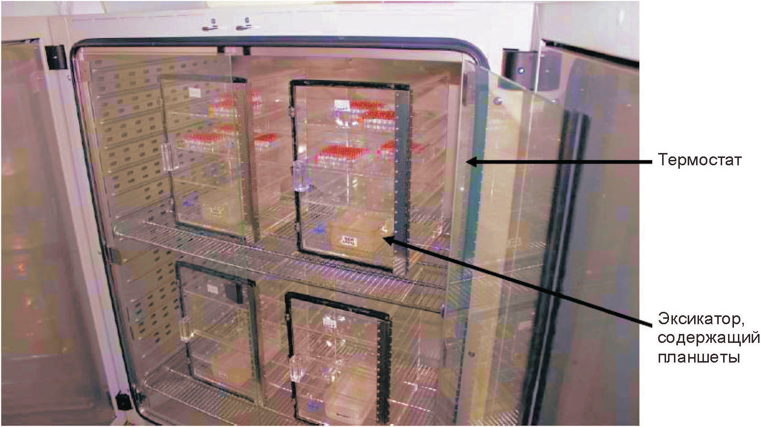 6.1.2 Данные планшеты помещают в герметичный эксикатор из плексигласа (например Nalgene 5314-0120 или 5317-0180 в зависимости от требуемого объема) с чашкой, наполненной насыщенным раствором сульфата калия (K