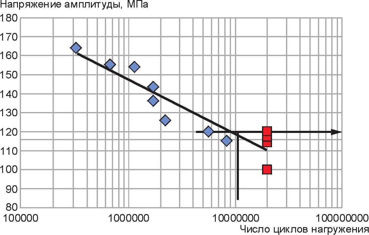 На наклонной ветви кривой усталости (далее КУ) испытано 8 колес, на горизонтальной - 4.