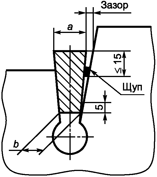 Боковые стороны профиля при проверке должны плотно прилегать к сторонам шаблона. Плотным прилеганием считается такое взаимное положение шаблона и профиля, при котором в зазор между ними не входит щуп. Для полос высотой h более 30 мм измерение зазора должно проводиться на расстоянии не менее 15 мм от основания a (рисунок 3).