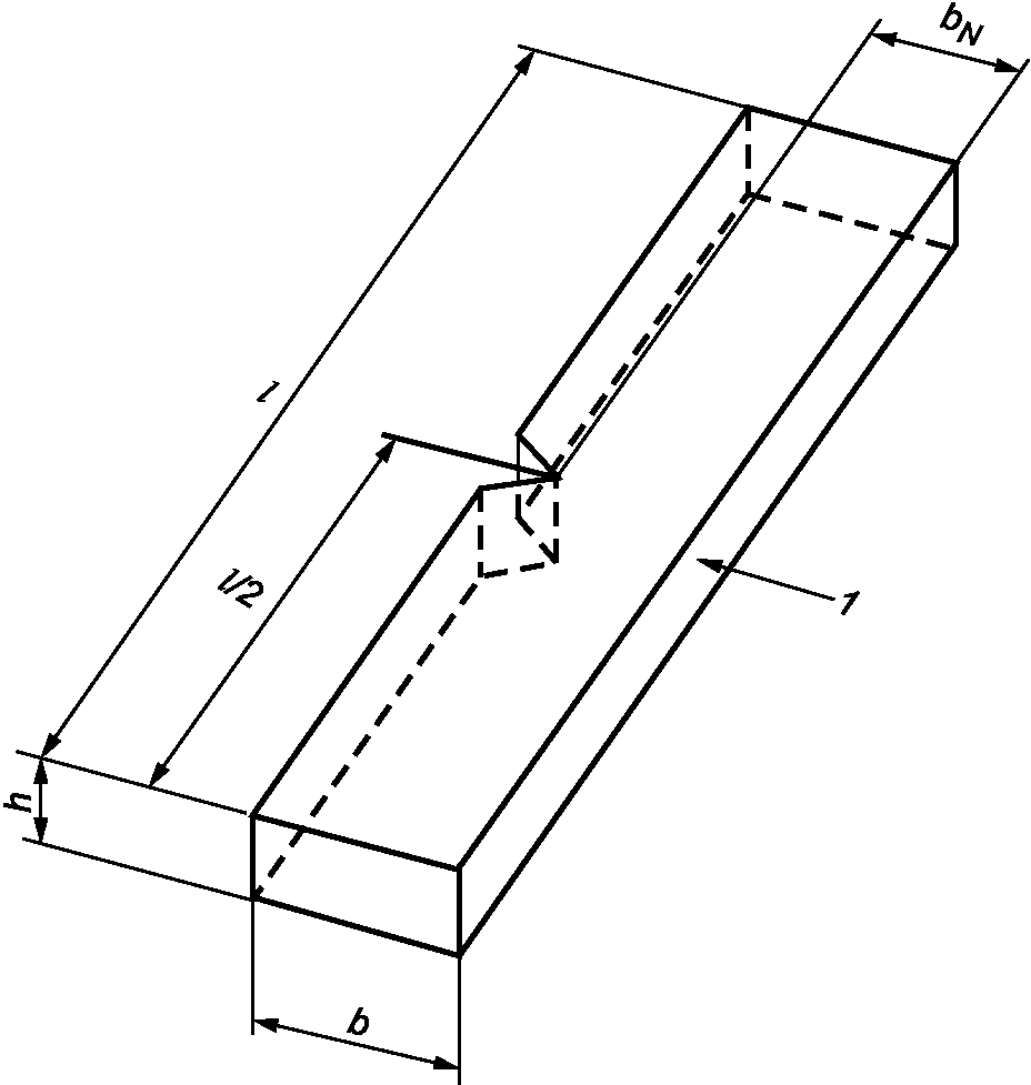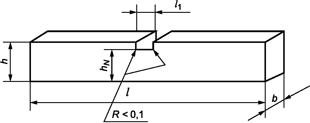 Если необходимо измерить влияние поверхностных эффектов для средне- и высокоударопрочных материалов, можно применять удар плашмя, используя образцы с двойным V-образным надрезом. Оба надреза перпендикулярны к линии удара. Размер каждого надреза