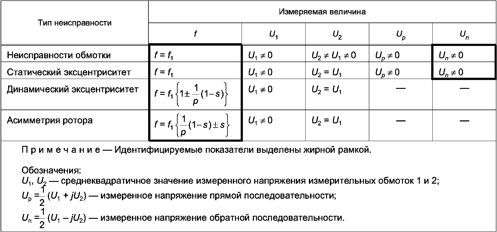 таблице 2. Критерием неисправности в обмотке является наличие обеих симметричных составляющих (прямой и обратной последовательности) на основной частоте. Напряжения в случае статического эксцентриситета имеют также основную частоту, однако напряжение обратной последовательности