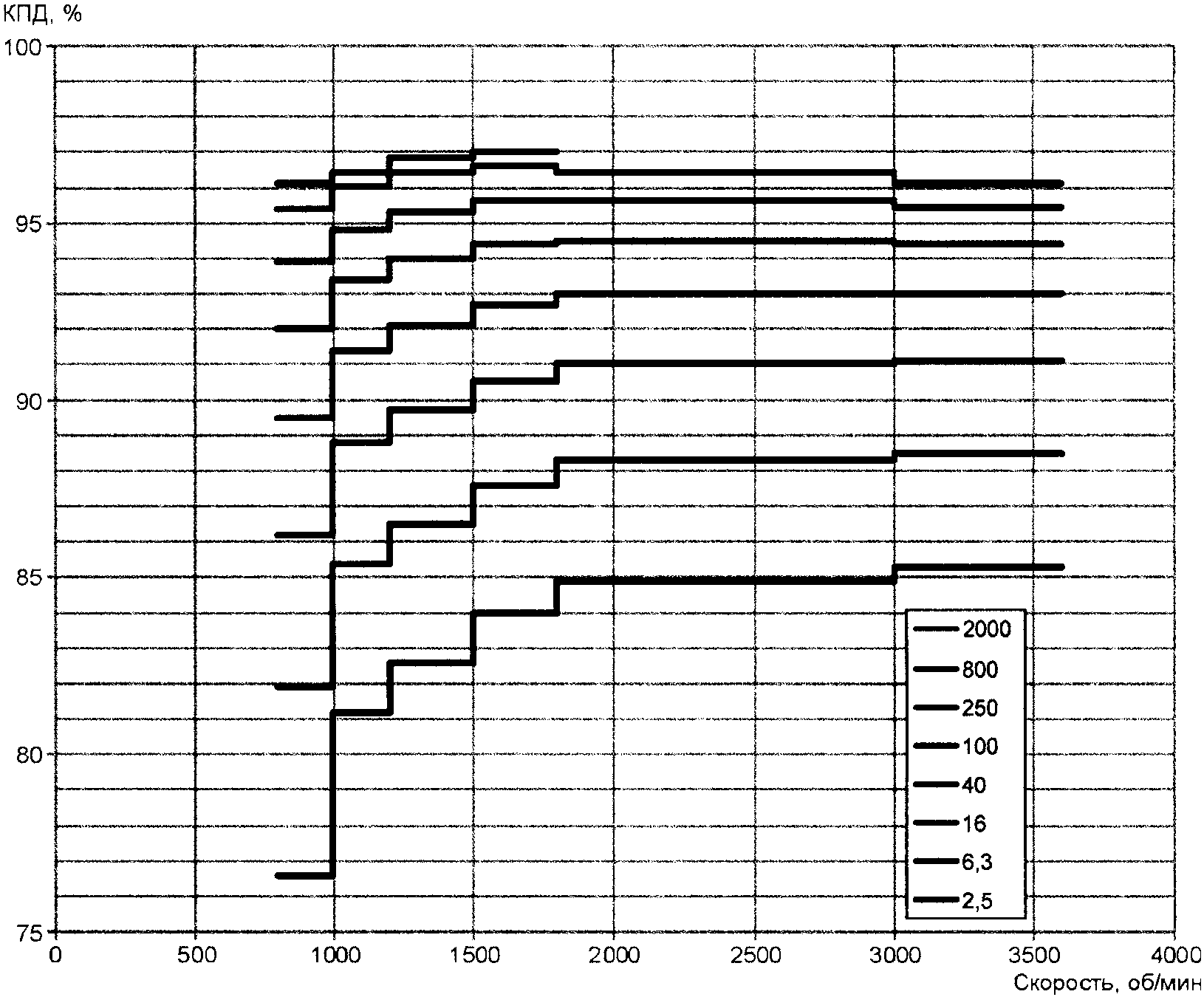 Как показано ниже, коэффициент полезного действия двигателя зависит главным образом от его нагрузки, номинальной мощности и скорости вращения: