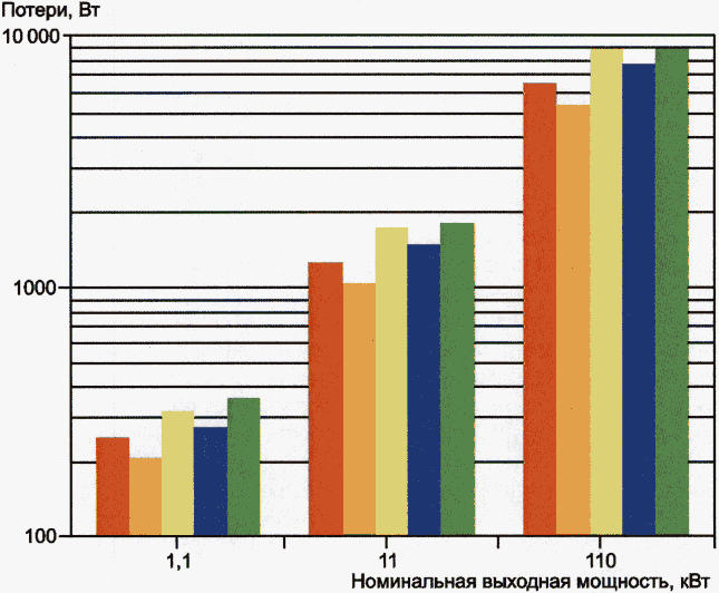 рисунке 2 представлен общий обзор типичных потерь мощности в энергосберегающих двигателях в сравнении с типичными потерями в системах силового привода, включая двигатели с преобразователями частоты питающей сети, оснащенные и не оснащенные катушками электромеханических тормозов.