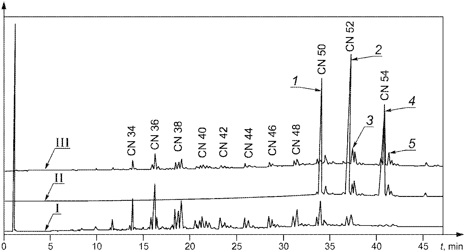 Идентификация пиков: 1 - POP; 2 - POS; 3 - POO; 4 - SOS; 5 - SOO; I, II, III, CN 34 до CN 54