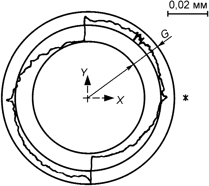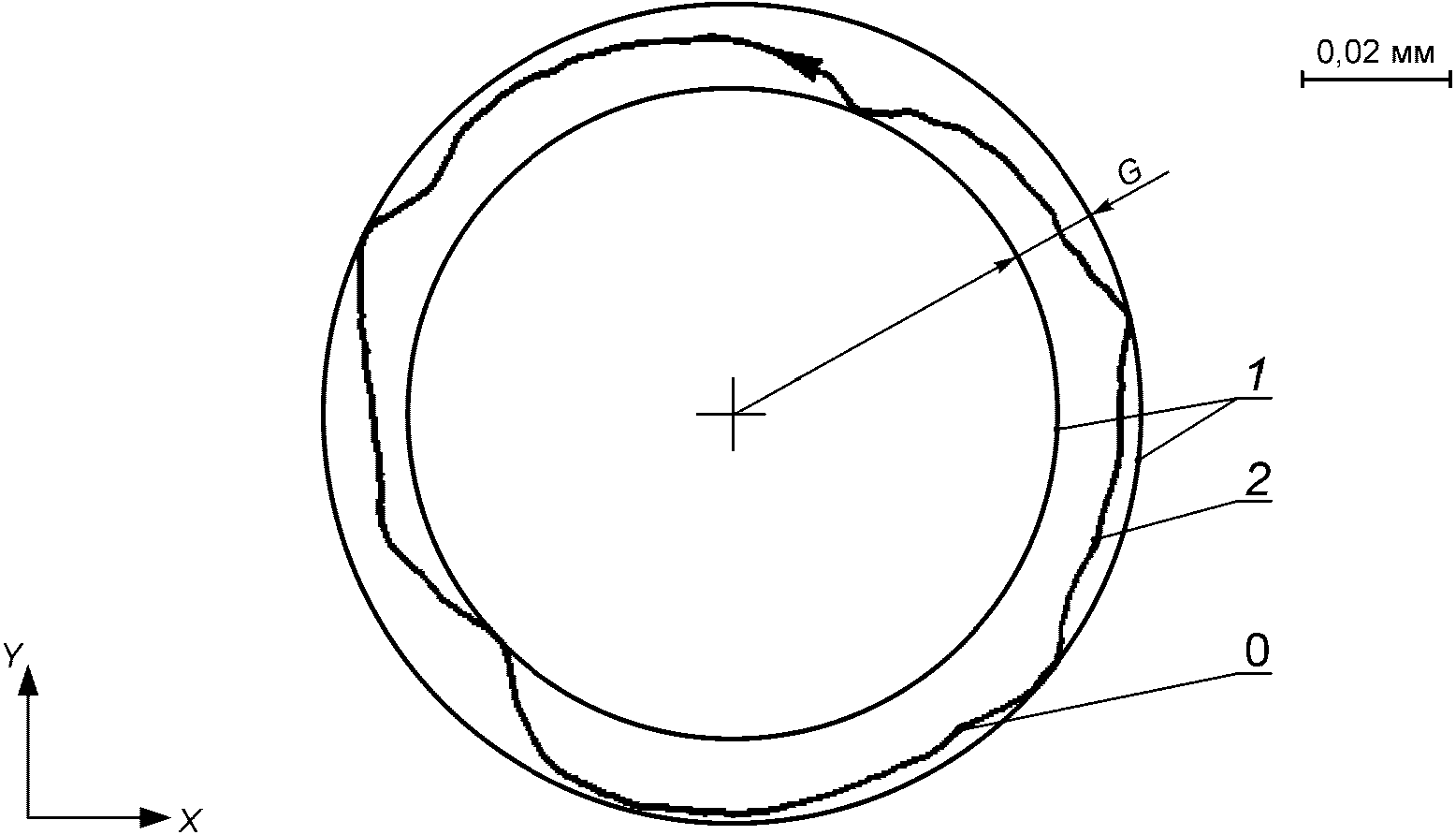 3.4 круговое отклонение (circular deviation) G: Минимальное радиальное расстояние между двумя концентрическими окружностями, описывающими фактическую траекторию (окружности минимальной зоны) по часовой стрелке или против часовой стрелки контурной траектории, которое может быть оценено как максимальный радиальный диапазон среднеквадратичной окружности.