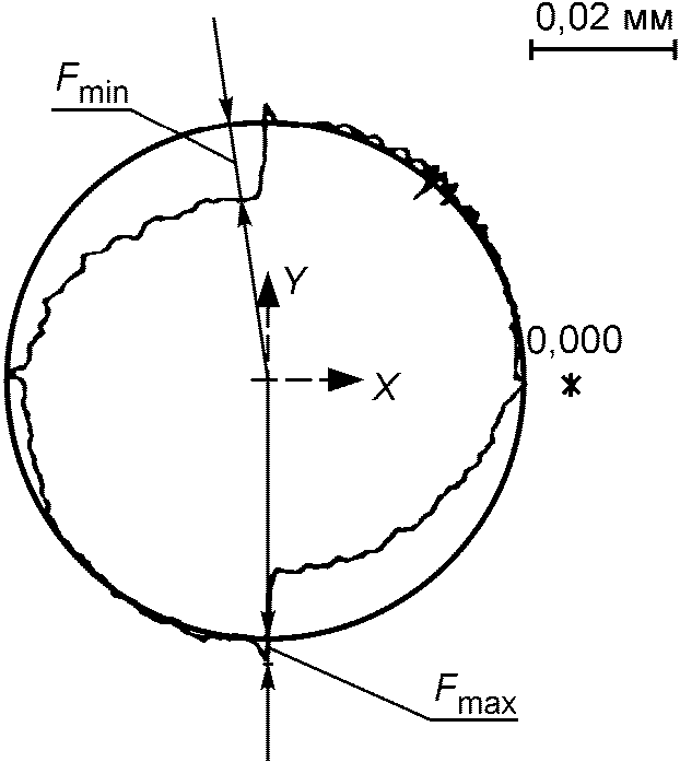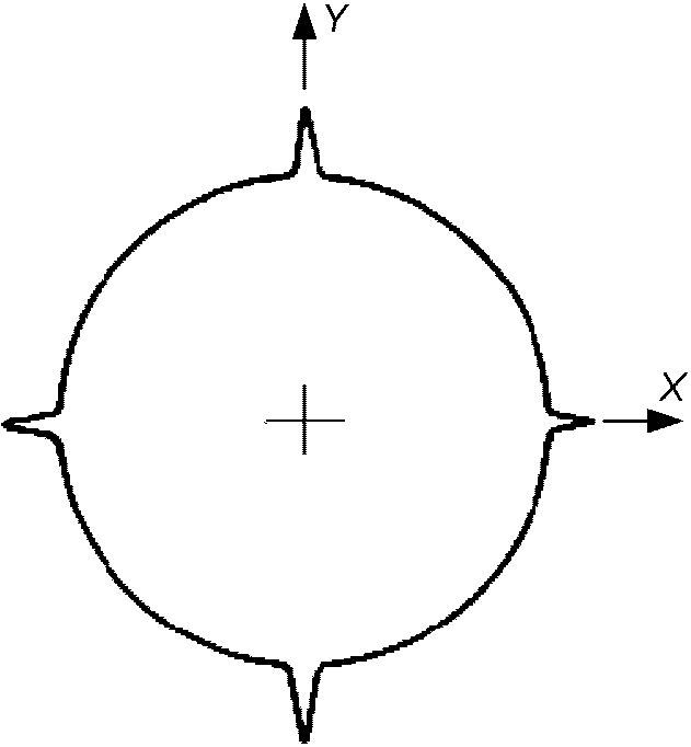 рисунке B.4 показаны типовые погрешности, возникающие вследствие образовавшегося зазора при реверсировании и происходящие в четырех точках с интервалом 90° (от каждой оси), что ведет к появлению четырех секторов с разными центрами. Для нормального зазора на
