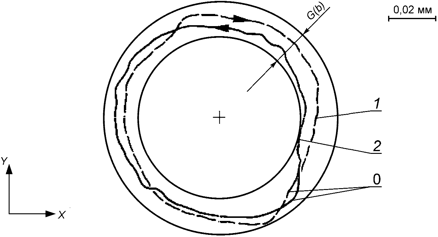 3.3 двунаправленное круговое отклонение (bi-directional circular deviation) G(b): Минимальное радиальное расстояние между двумя концентрическими окружностями (окружностями минимальной зоны), включающее две фактические траектории, причем движение по одной траектории происходит по ходу часовой стрелки, а по другой - против хода часовой стрелки.