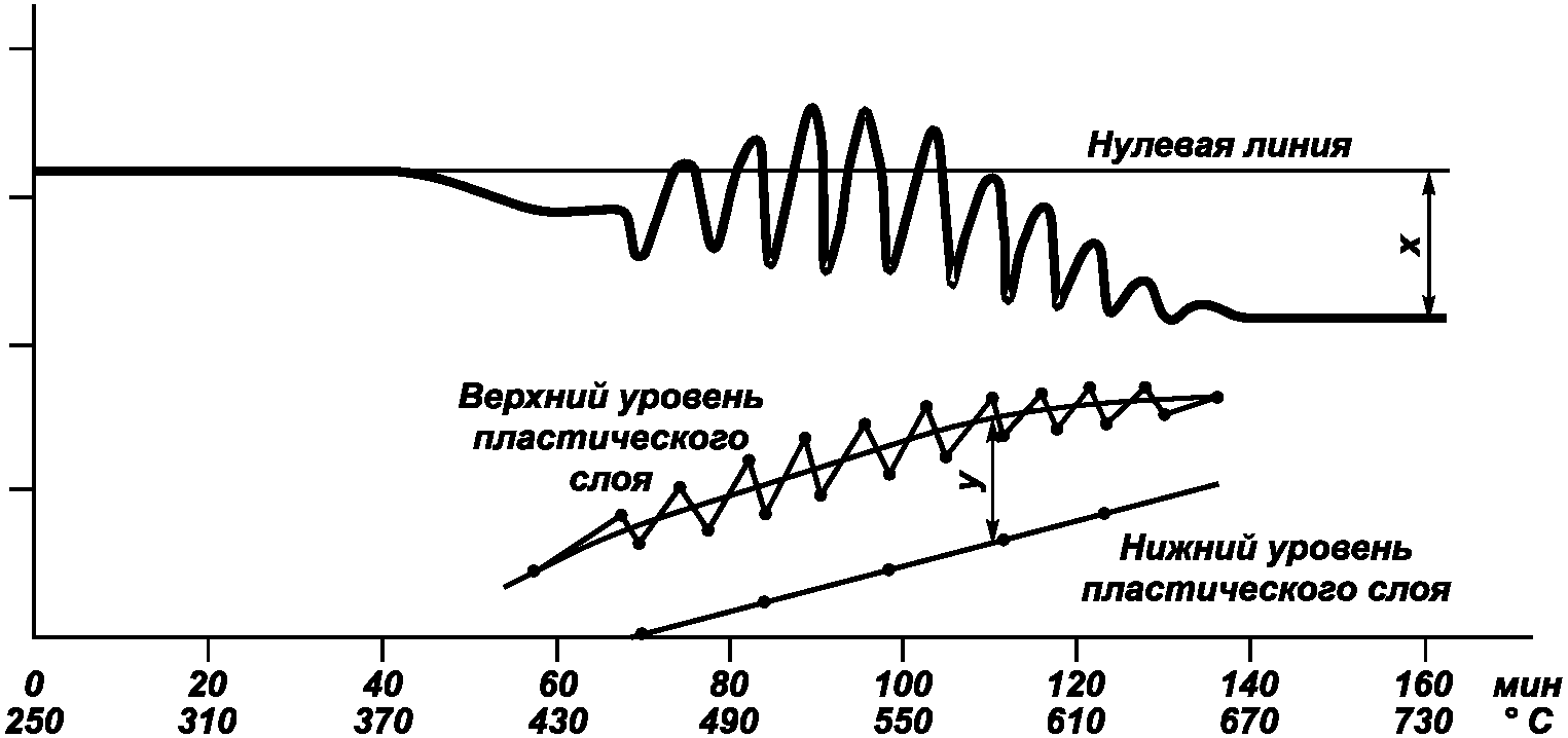 Замеры толщины пластического слоя иглой-пластометром начинают когда нижний слой угля переходит в пластическое состояние. Об этом свидетельствует снижение пластометрической кривой ниже начального уровня.