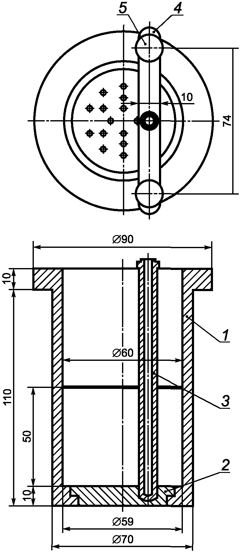Стакан пластометрический (рисунок 2) из стали 45 со съемным дном. Диаметр стакана, мм: наружный - 70; внутренний на уровне дна - 59; внутренний на высоте 50 мм от дна и выше - 60.