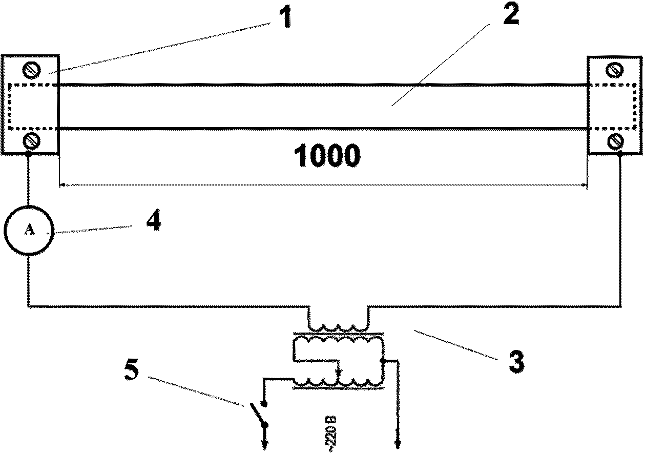 Отрезок токопроводящей ленты длиной 1 м закрепляют в разъемных медных пластинах. От регулируемого источника подают и устанавливают ток в испытуемом образце I = 40 А, отключают установку входным выключателем. Выдерживают паузу 5 мин для стабилизации теплового режима образца. Подают ток в испытуемый образец толчком включением выключателя. Контролируют и поддерживают ток I = 40 А в образце в течение 20 с.