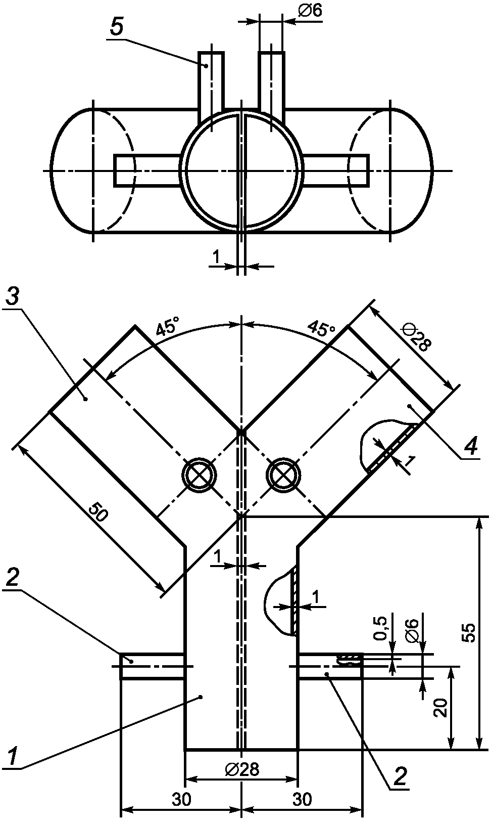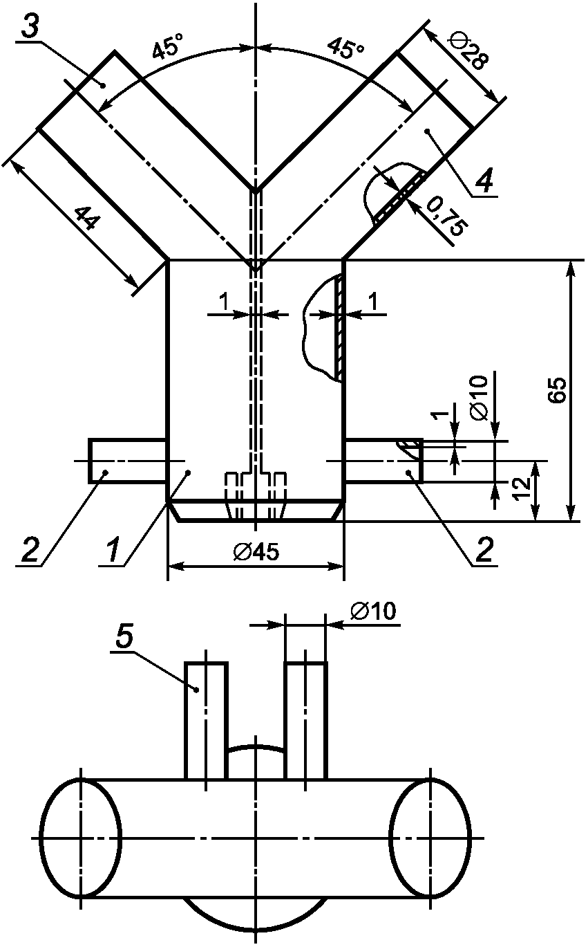 1 - выходной патрубок тройника; 2 - штуцер для присоединения