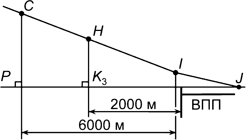 - контрольной точки под траекторией снижения на посадку - это точка на продолжении осевой линии ВПП, находящаяся на расстоянии 2000 м от порога ВПП под траекторией снижения на посадку. На ровной местности высота от этой точки до стандартной глиссады в 3°, пересекающей ось ВПП на расстоянии 300 м за ее порогом, равна 120 м.
