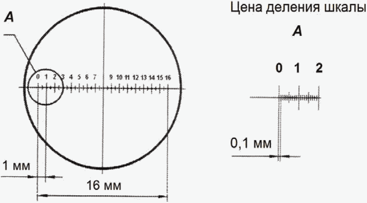 Окуляр-микрометр представляет собой линейную шкалу с делениями, нанесенную на стеклянную пластинку, вставленную в окуляр.