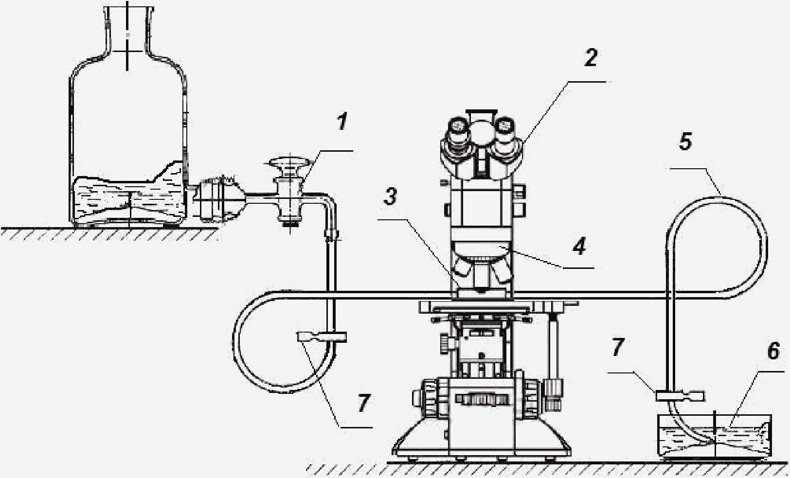 6.1, и со сливной чашкой. На шлангах устанавливают зажимы. Настройку оптической системы микроскопа, состоящую из окуляр-микрометра и объективов, фокусировку и калибровку проводят согласно инструкции по его эксплуатации, и как описано в
