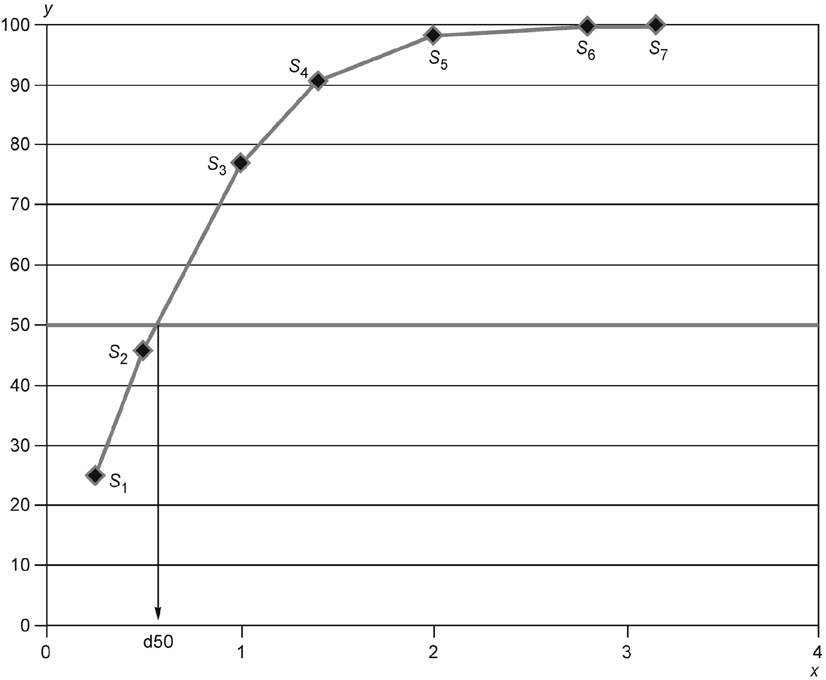 Средний размер кусков (частиц) [d50], определяемый при ситовом анализе, - это расчетная величина, представляющая собой размер частиц, масса которых в сумме с массой более мелких частиц составляет 50% от массы рассеваемой пробы. Масса более крупных частиц составляет вторую половину массы рассеваемой пробы. Таким образом, средний размер частиц делит кривую зависимости суммарного выхода классов крупности от размера частиц на две части. Графически средний размер частиц на этой кривой определяют в точке пересечения с горизонтальной линией, проведенной на уровне 50%