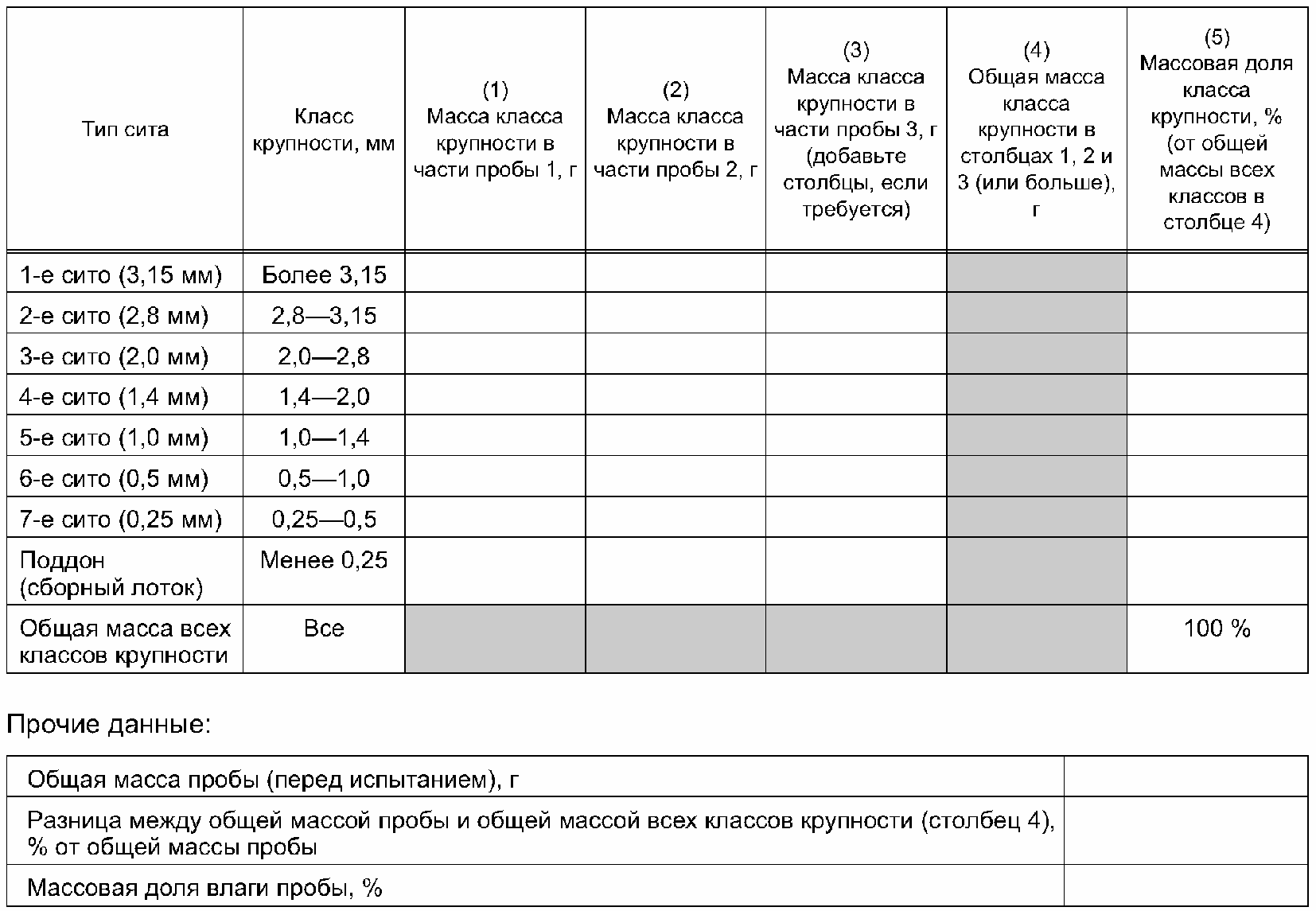 Результат определения представляют в виде массовых долей отдельных классов крупности, выраженных в процентах от общей массы всех классов крупности (выход класса крупности). Если пробу перед испытанием делили на несколько частей, то массы одинаковых классов крупности всех частей пробы должны быть сложены перед расчетом массовой доли каждого класса крупности. Форма записи показана в таблице 1.