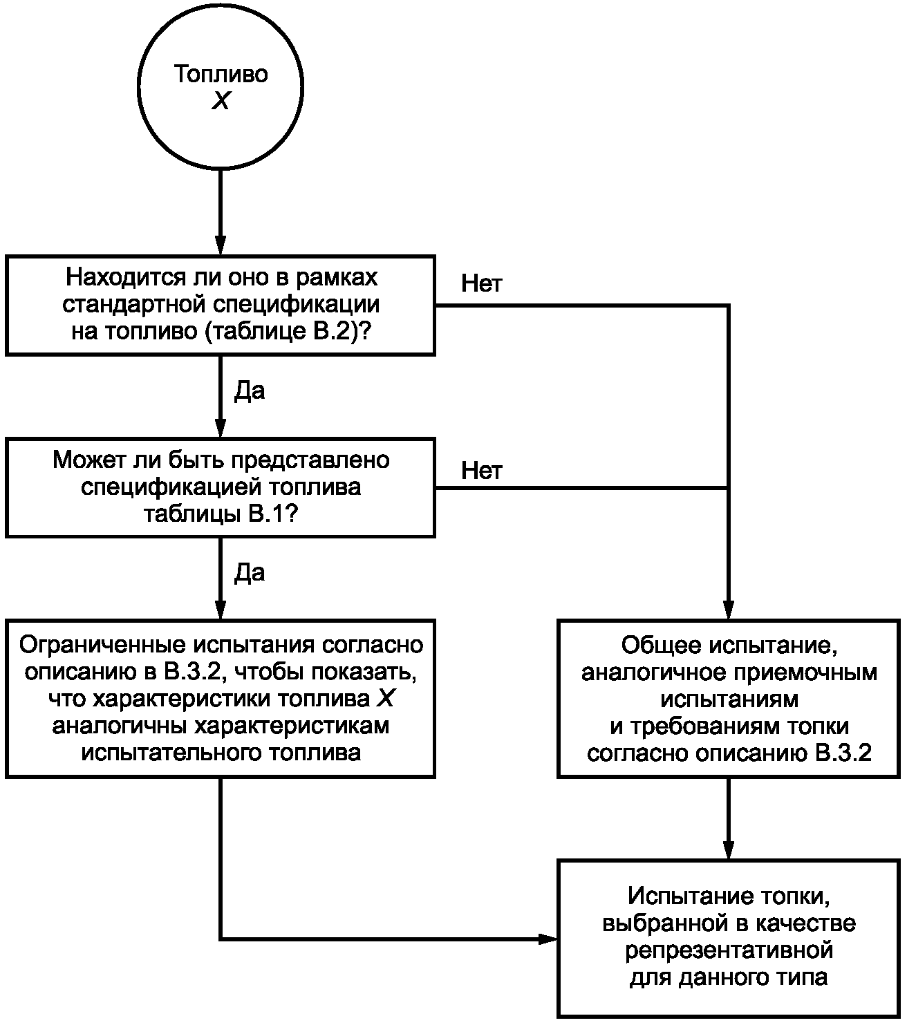 таблице B.2 для общедоступных видов топлива, либо его характеристики и свойства таковы, что его параметры не могут быть предварительно названы исходя из данных или анализа, топливо следует проверить полностью. Топливо следует проверить на прошедшем предварительную проверку соответствия образцу стандартном отопительном аппарате, выбранном в качестве репрезентативного для класса и/или типа аппаратов, в котором топливо должно сгорать так, чтобы выполнить приведенные в