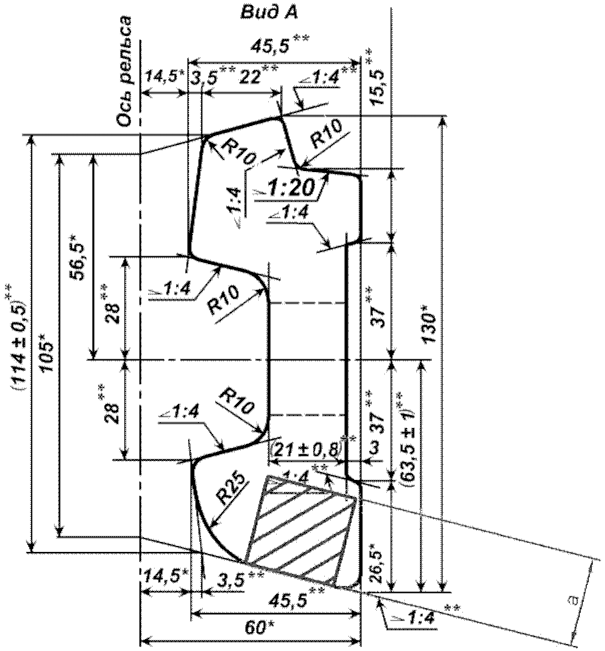 <**> Размеры, в том числе подлежащие контролю при подтверждении минимально необходимых требований безопасности.