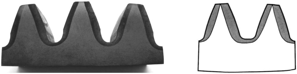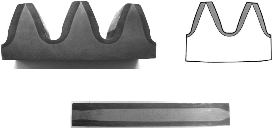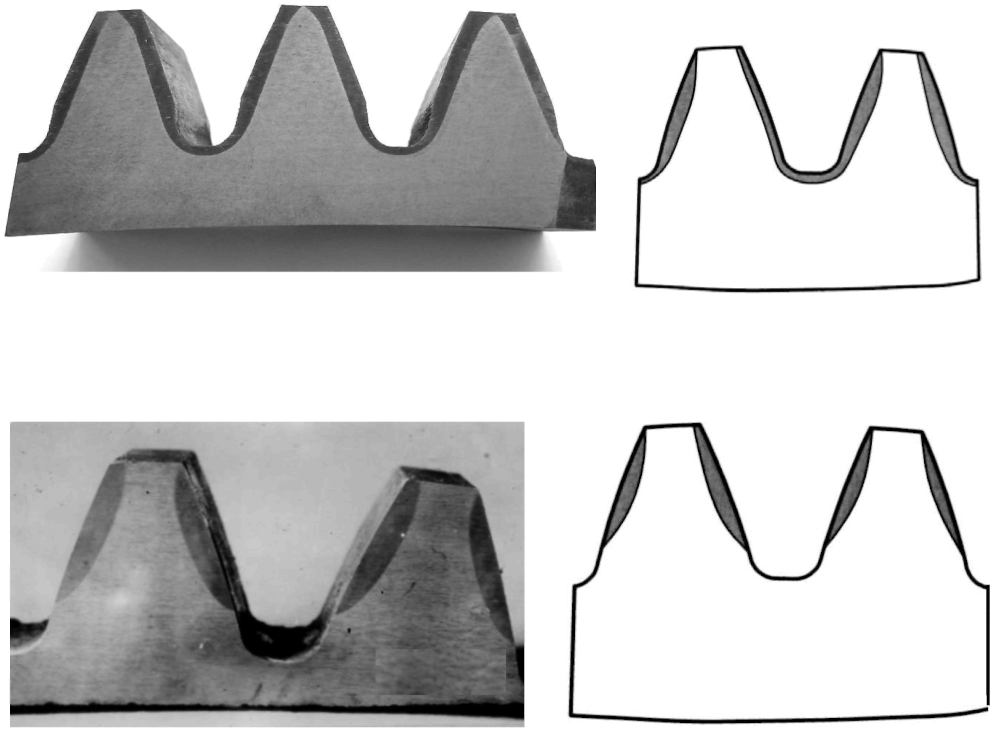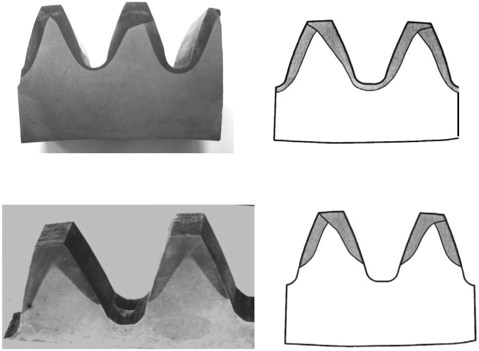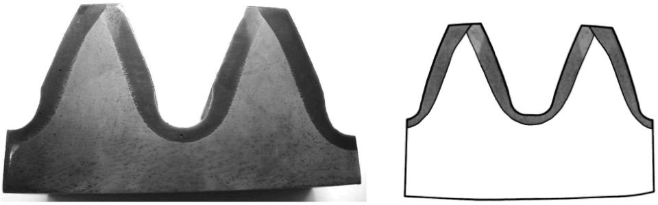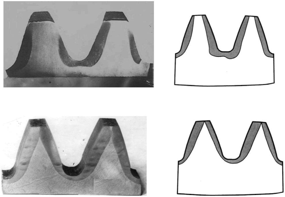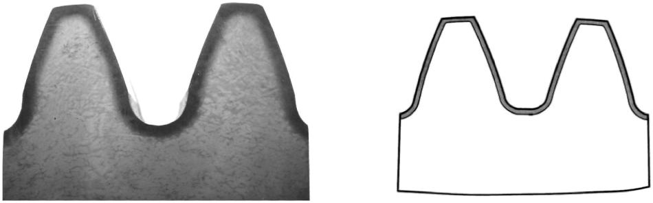 | Перекрытие слоев по всей вершине зуба без выхода на активную поверхность, наличие светлых пятен в упрочненном слое | Конфигурация и твердость слоя неудовлетворительные |